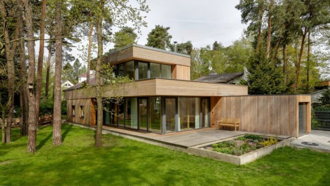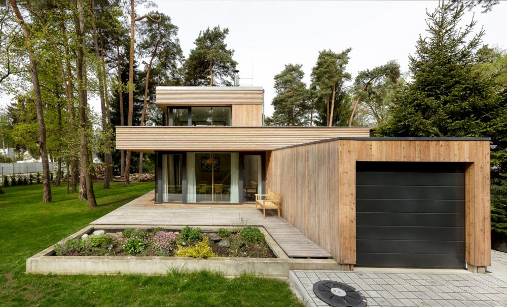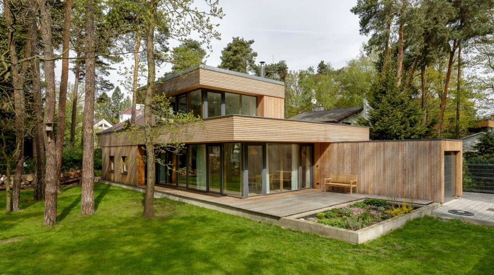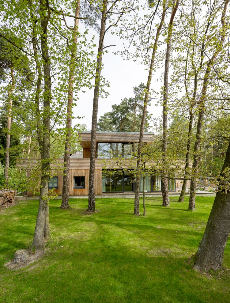 Na zalesněné zahradě mezi stromy vyrostl dřevěný dům. Dům,