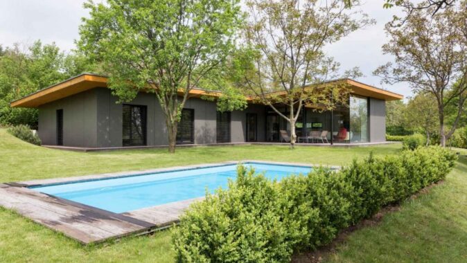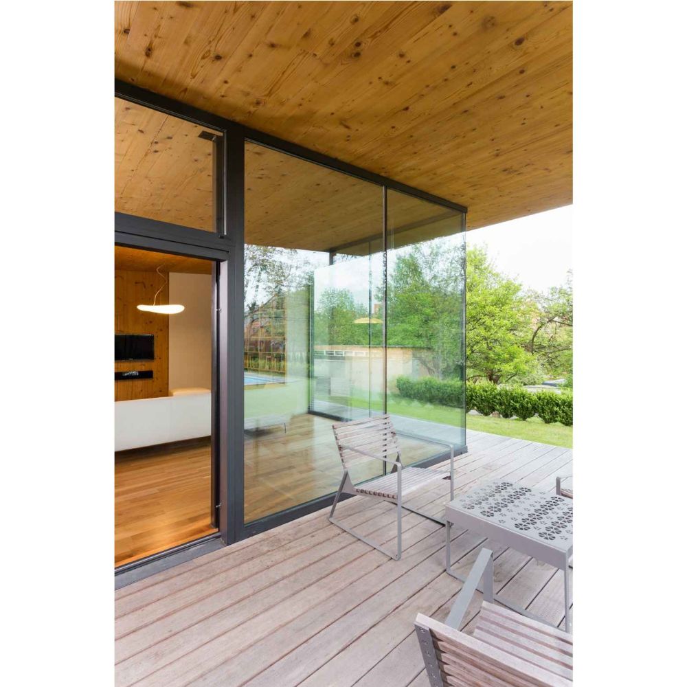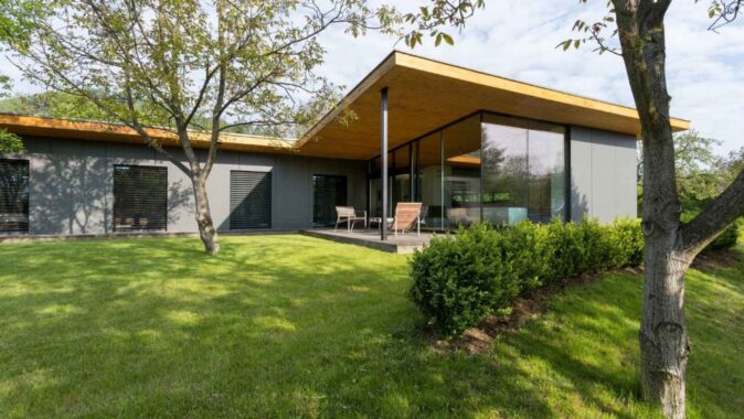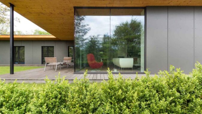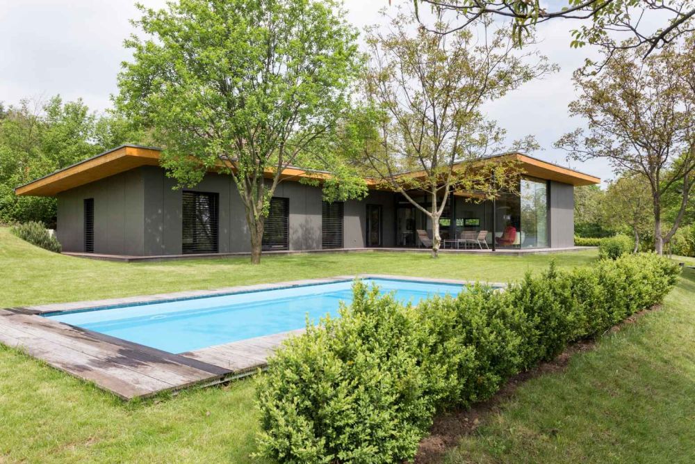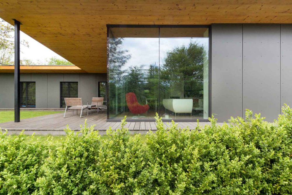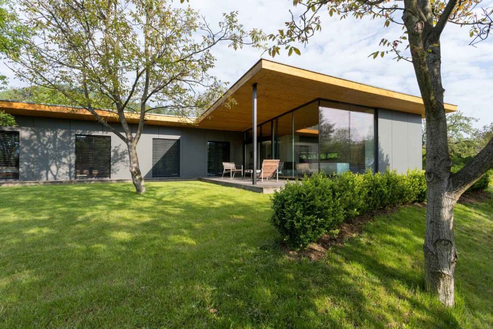 Přízemní úsporný dům byl navržen s konceptem dvou horizontálních dřevěných desek (podlaha a strop) a uvnitř vytvoření života domu. Rozdělen je do dvou křídel, které vytvářejí v půdorysu písmeno L. V prvním z nich se nachází společenská část, které vévodí obývací prostor, jenž je prosvětlen skleněnými stěnami do zahrady. V druhém křídle je klidová část domu s ložnicemi. Poloatrium doplňuje terasa.