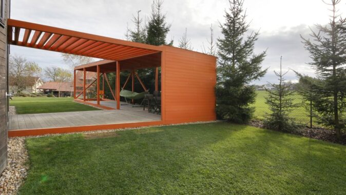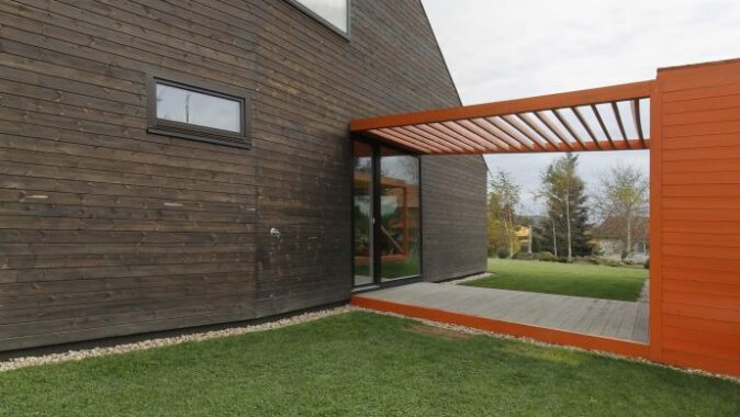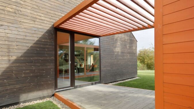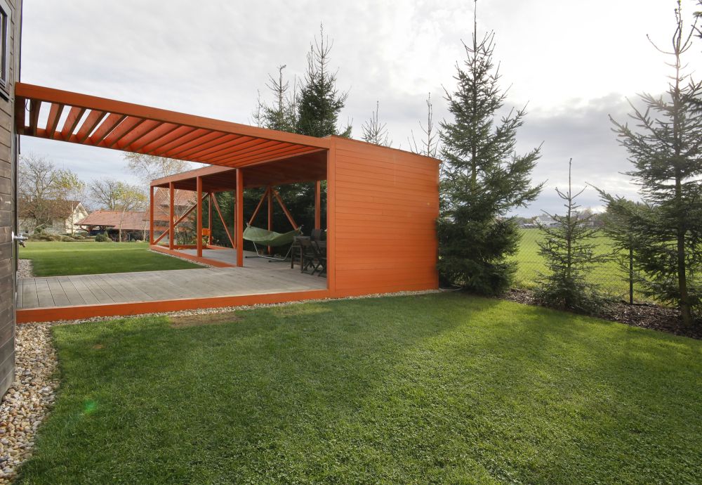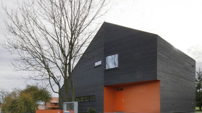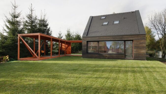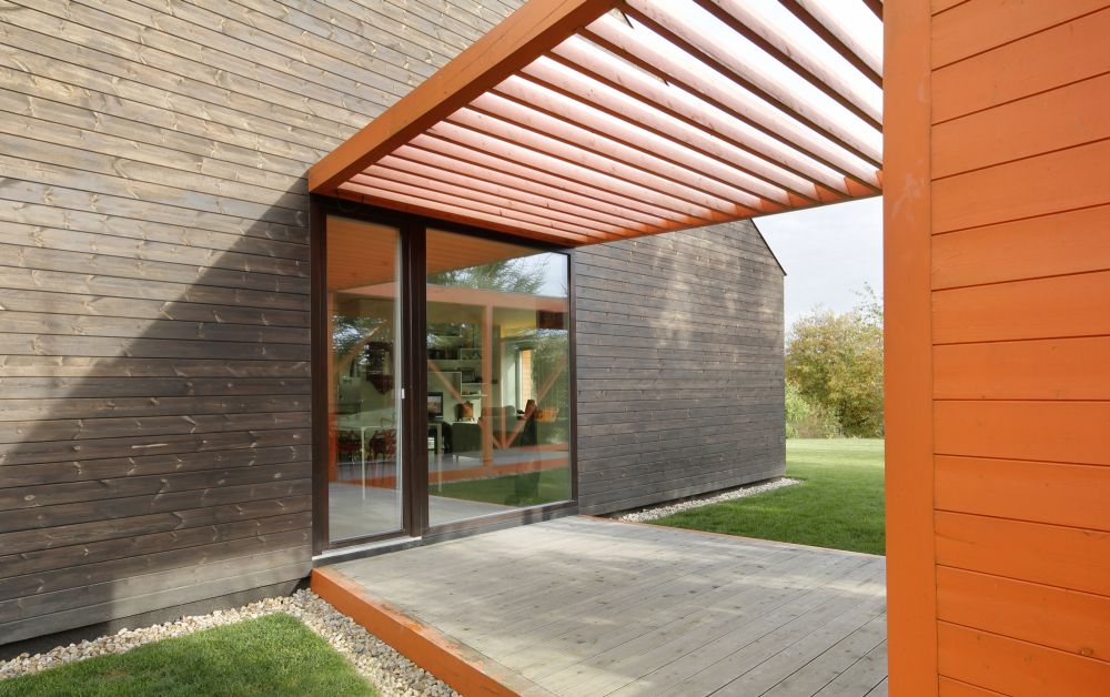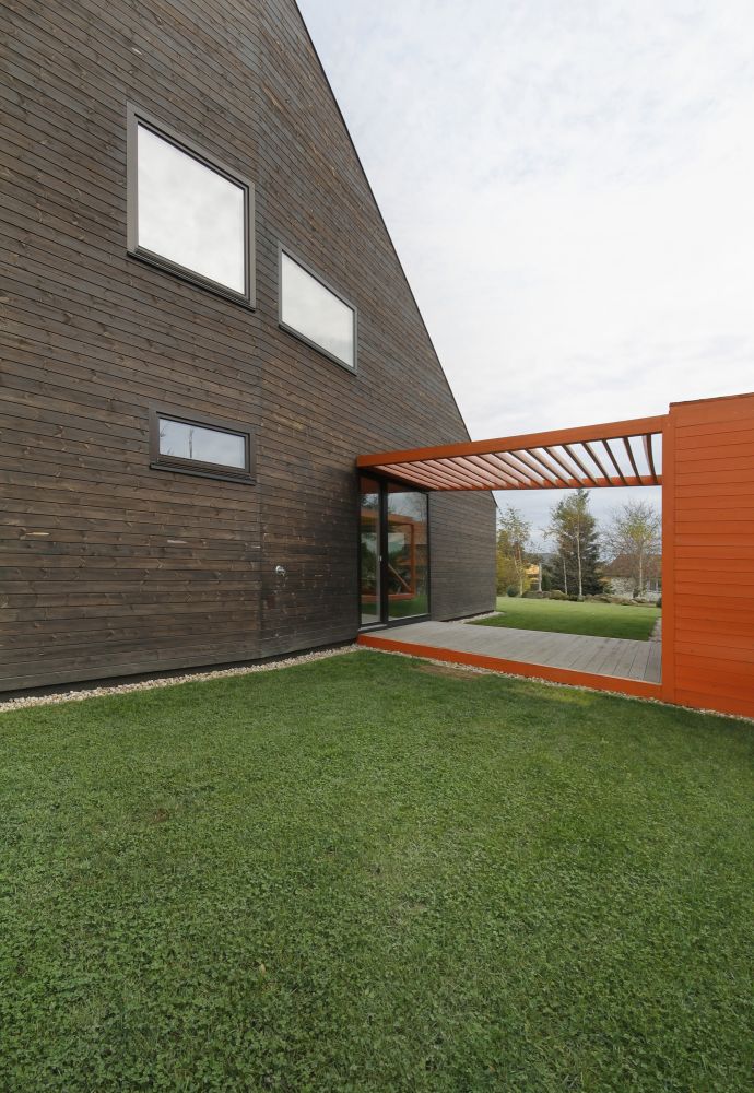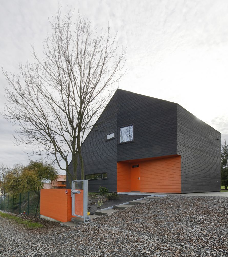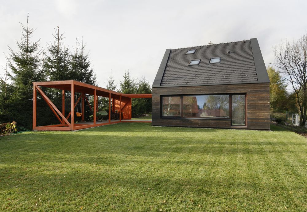 Dům se nachází na severozápadním okraji obce, v místech, kde se otevírá výhled do krajiny. Příjezdová komunikace se tu mění v úvozovou cestu. Jeho hmota má kompaktní geometrický tvar, který vychází z lichoběžníků – respektuje tak tvar pozemku a zároveň modeluje hmotově nenápadnou stavbu v otevřeném plenéru, která svým zužujícím se čelem i zády klesá k terénu.