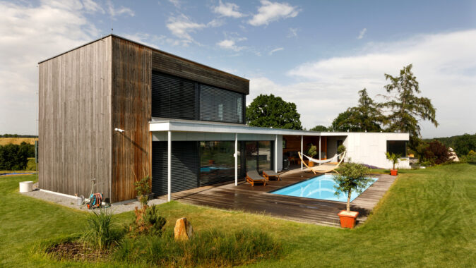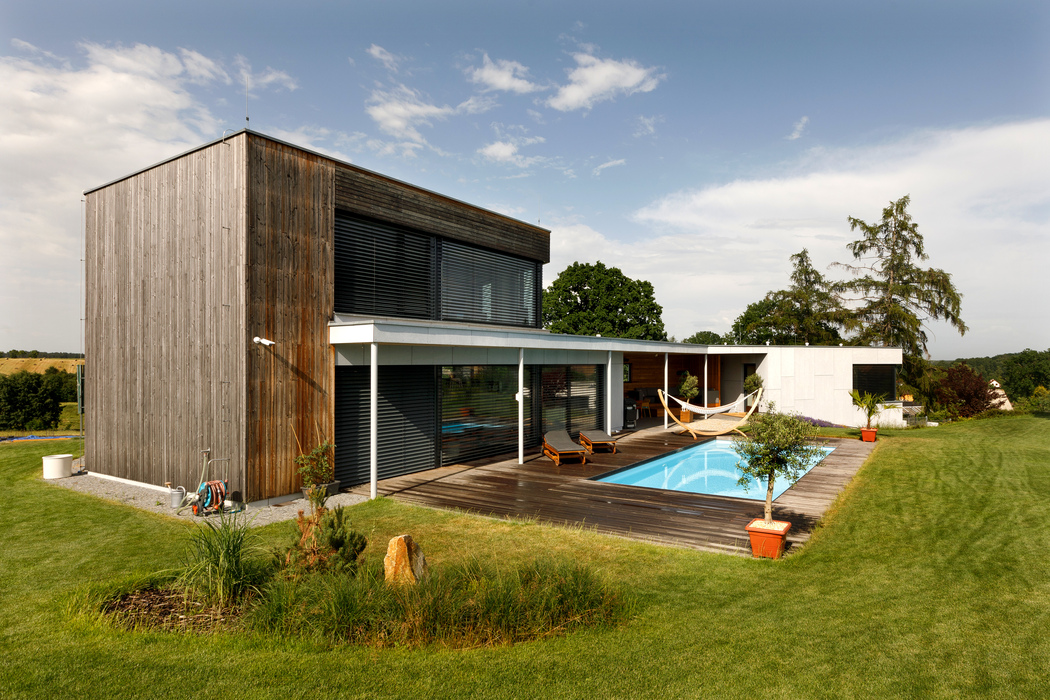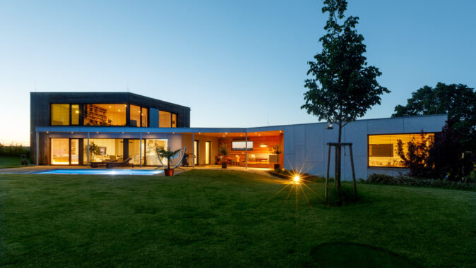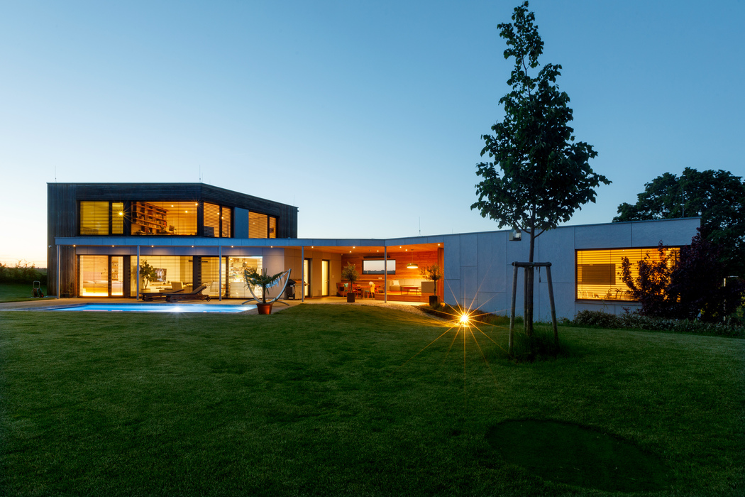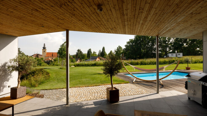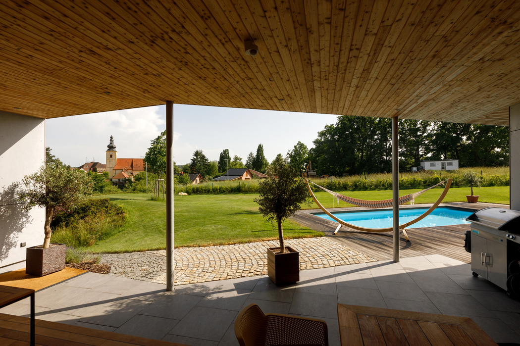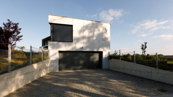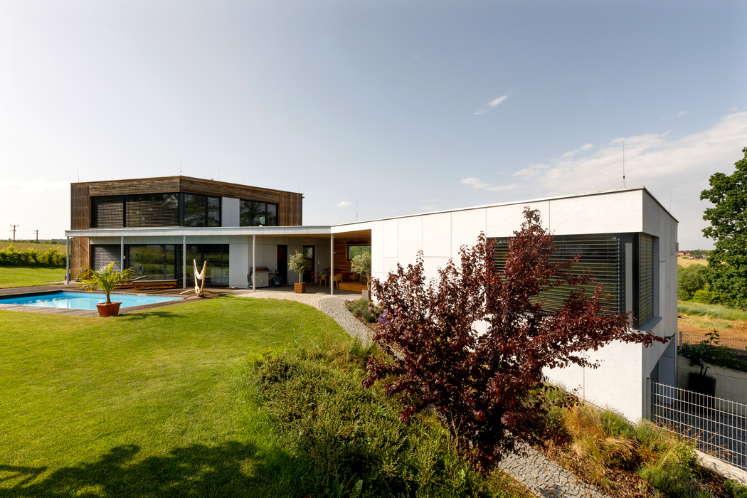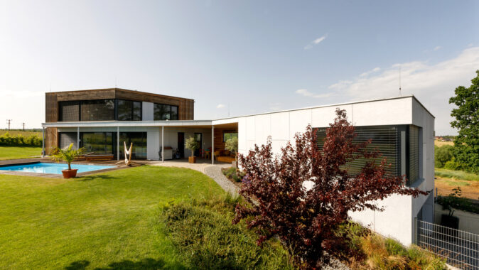 Na počátku byl pozemek v jihočeských Ledenicích a investorovo soukromé výběrové řízení se třemi velmi odlišnými studiemi. Návrh cihlového (HELUZ) a velkoryse proskleného (Schüco) domu od Ateliéru Vostracký zvítězil praktičností a dokonalým pochopením potřeb a přání budoucího majitele, včetně ladovského výhledu na kostelík s farou z rohové, impozantně prosklené pracovny v patře i z terasy v přízemí. Pán domu by ani po třech letech bydlení nic z původního návrhu neměnil, protože se mu zde žije a pracuje spokojeně – lépe, než je u prvních soukromých staveb běžné.