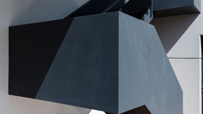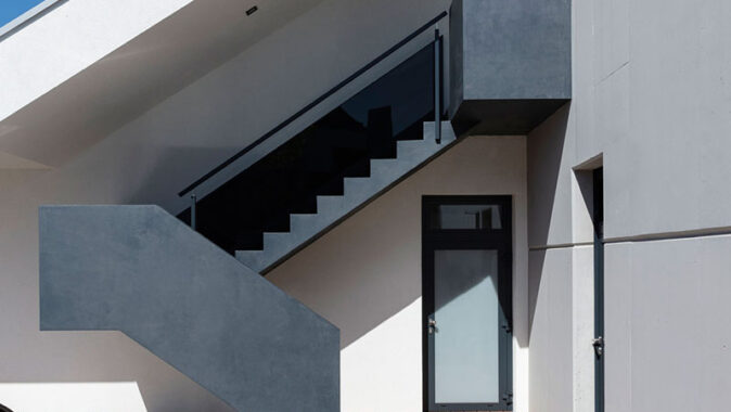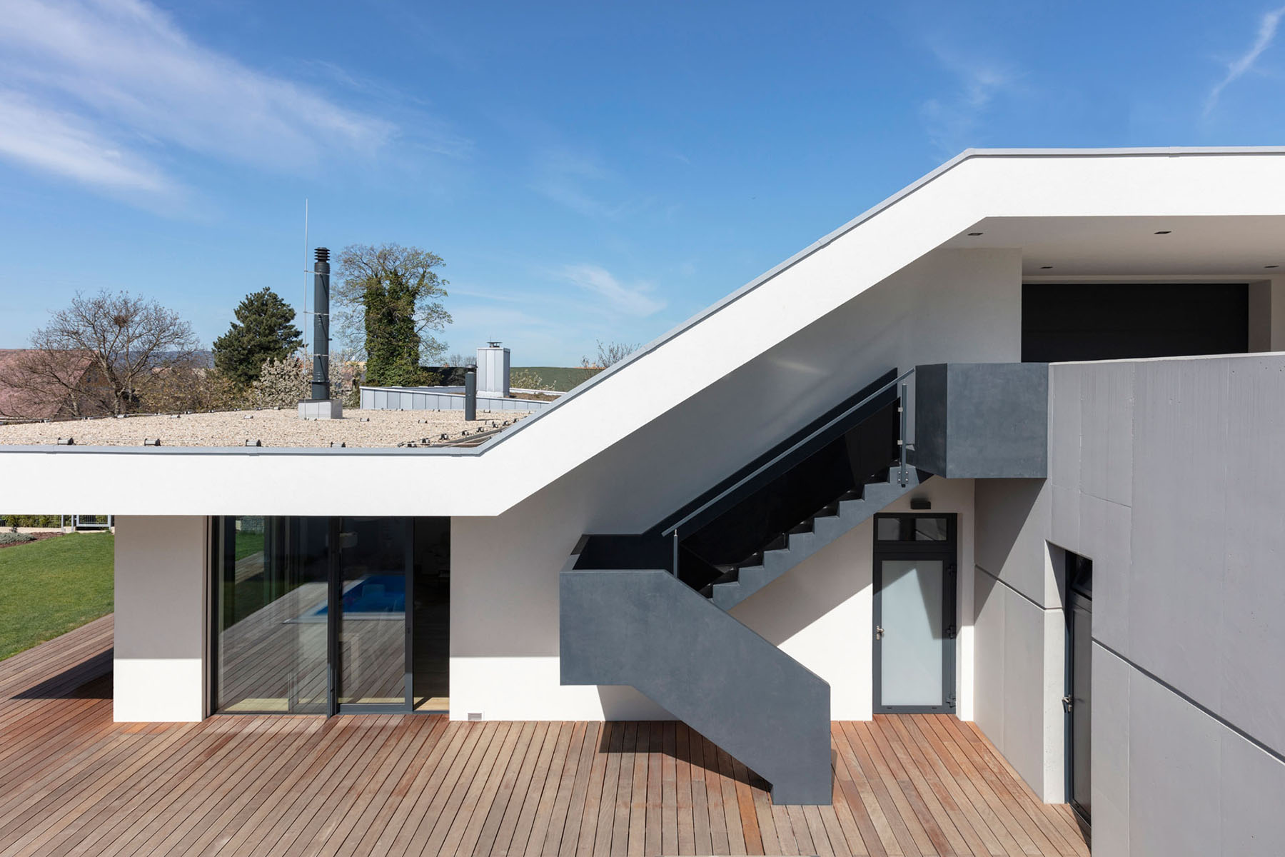 a zázemí. Obě podlaží propojuje výrazné venkovní schodiště z betonu, na