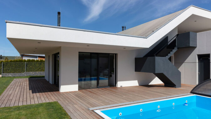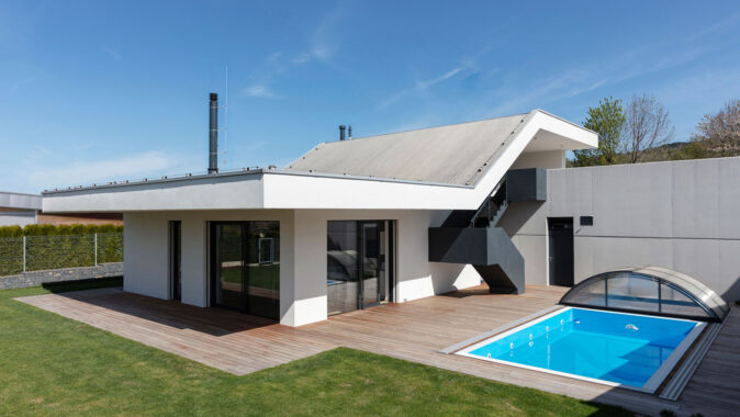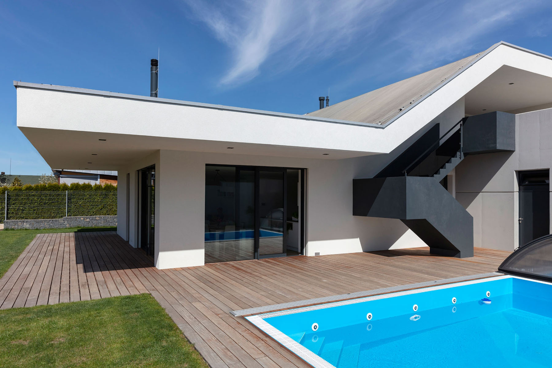 kryto zalomenou střechou. Ta zároveň funguje jako stínící prvek dřevěné