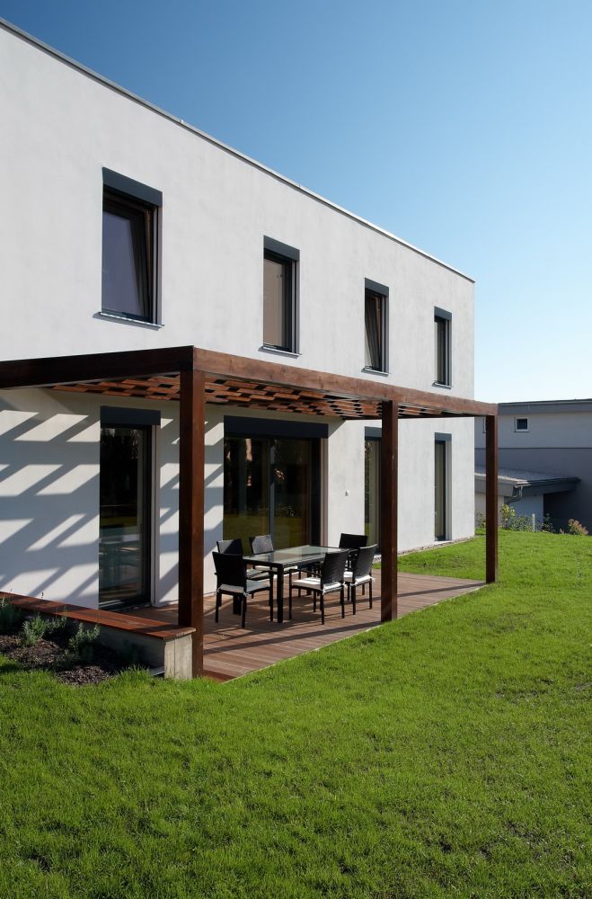 Objem stavby je pomyslně rozdělen na tři části – kvádry. Dominuje obytná část, k níž je přisazená hmota garáže a dřevěná konstrukce pergoly nad terasou. Jednoduché konstrukční řešení i detaily stavby jsou řešeny tradičně.