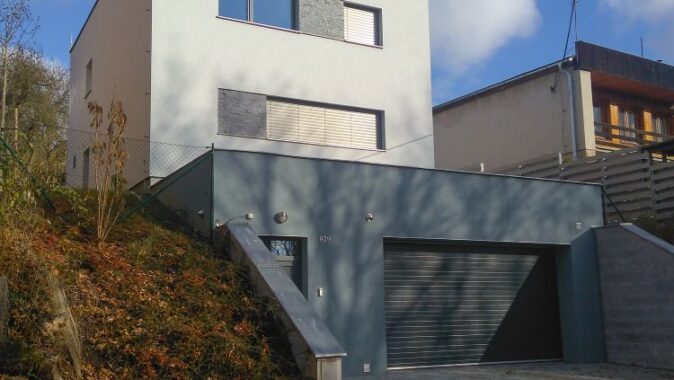 v terénu. Obsahuje garáž, technickou místnost se skladem a schodiště pro