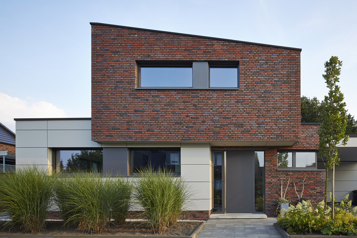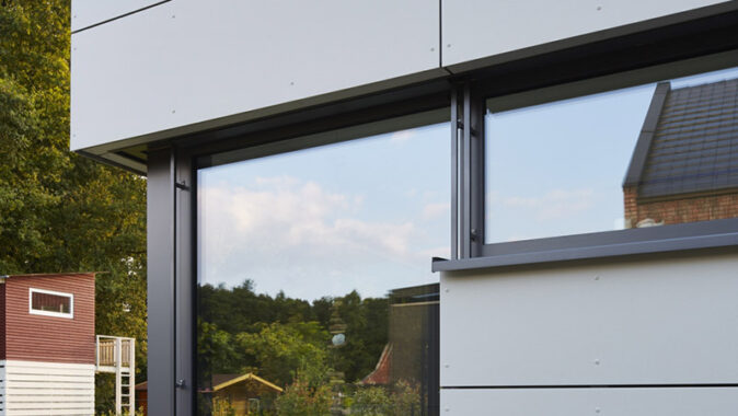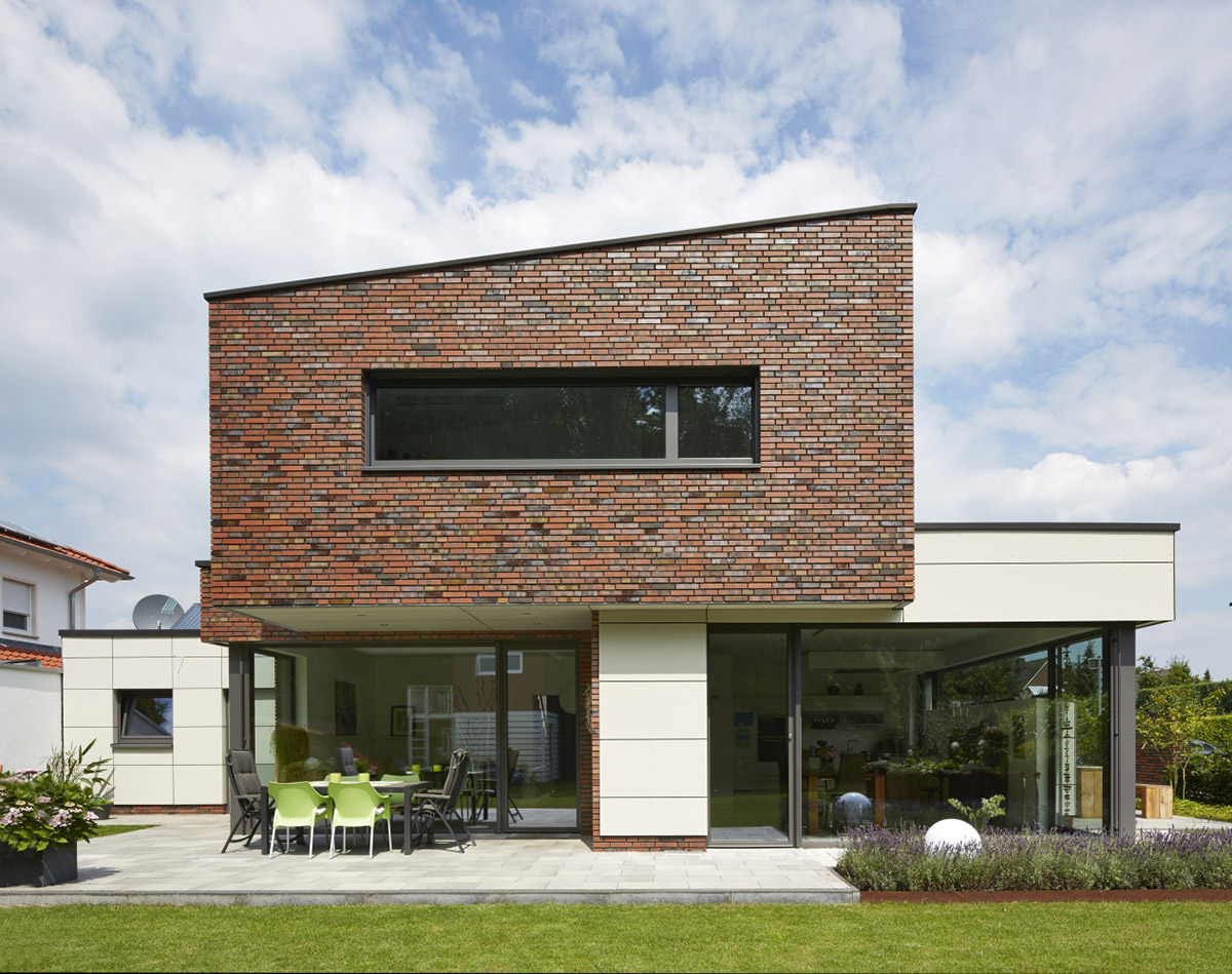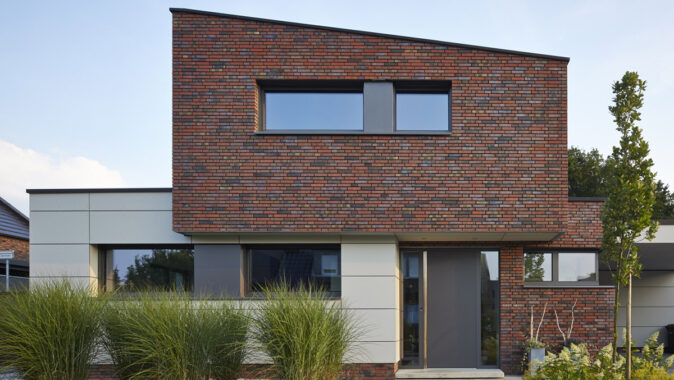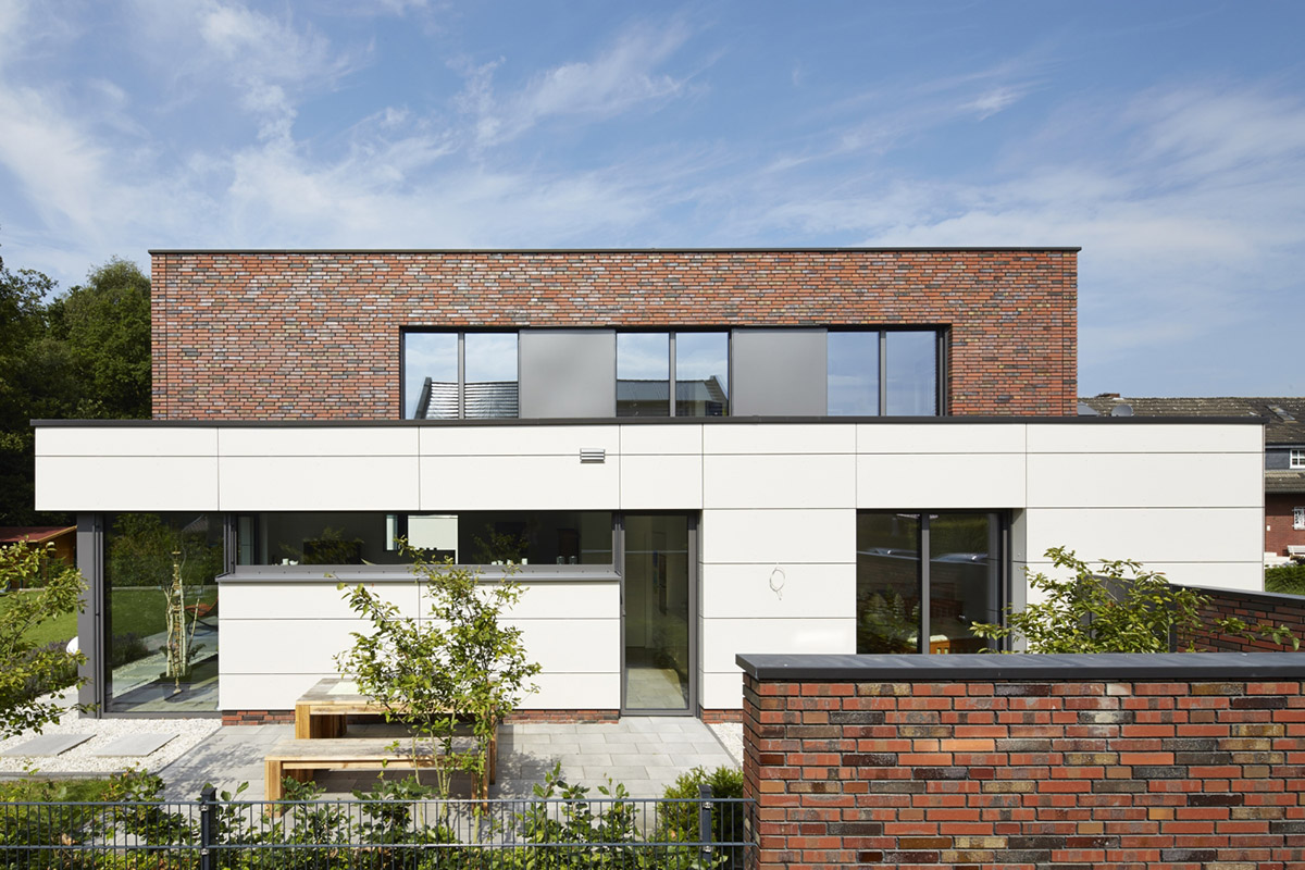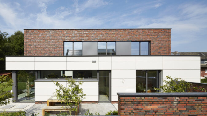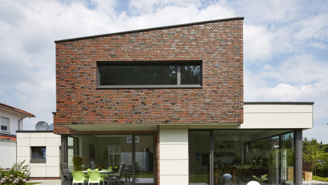 stupňovitým uspořádáním dvou stavebních objektů a využitím různých fasádních
