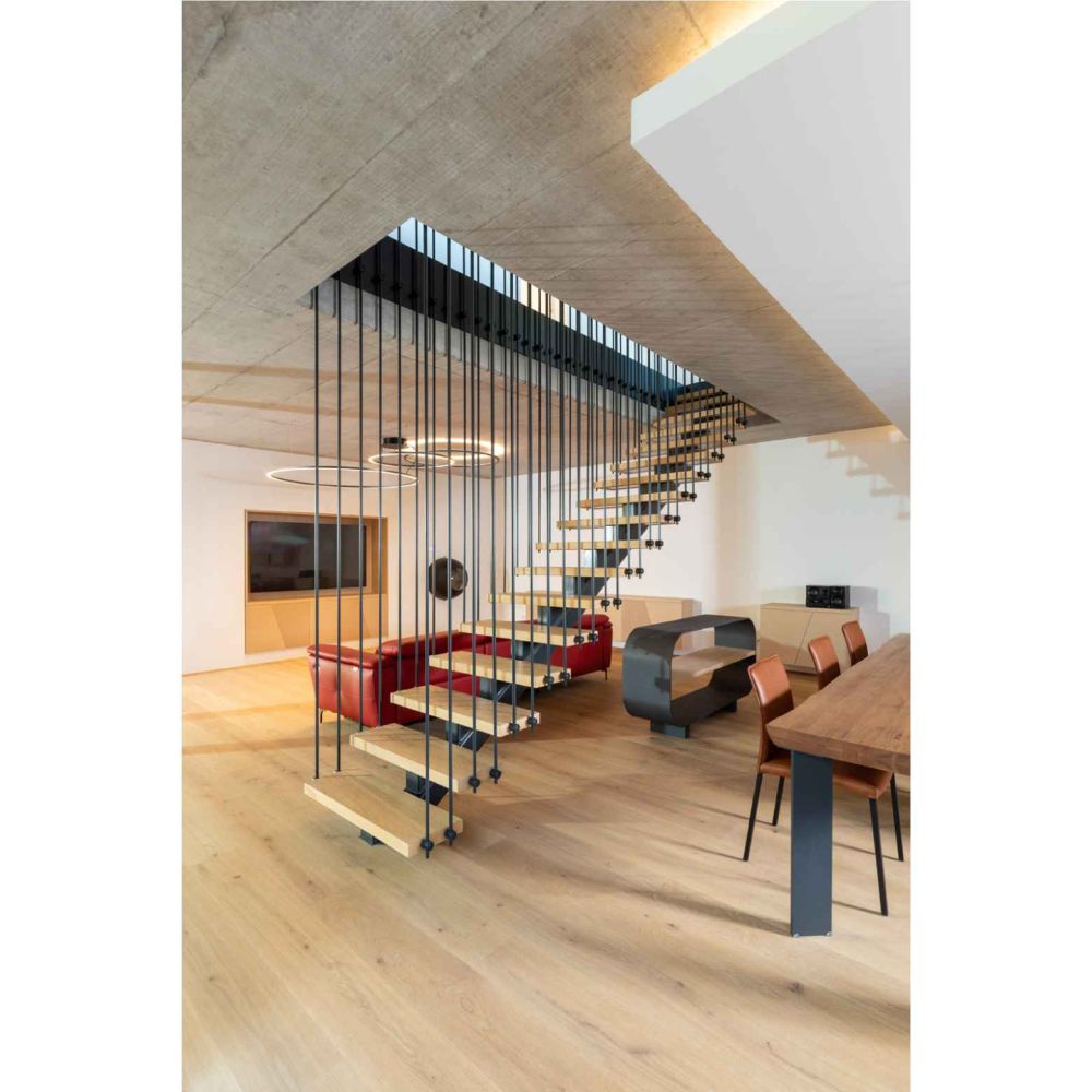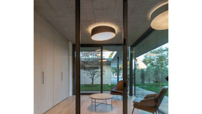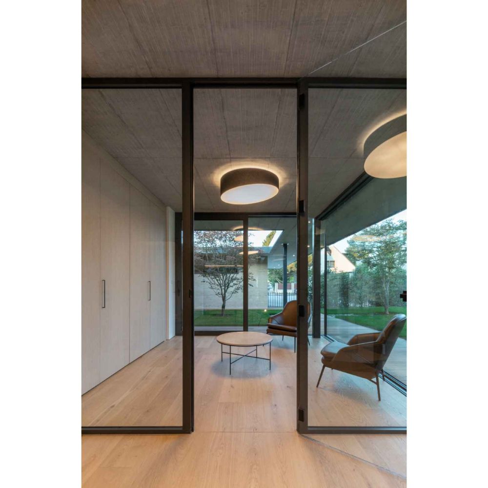 Navrhli jsme dům umístěný podél severní strany pozemku. Uprostřed parcely se nachází obytná a klidová část, opticky oddělená na dva relaxační prostory. Přední reprezentační a oddychový prostor zahrady se vstupní částí, s pracovnou a atriem, skladem a přístřeškem pro automobily. Zadní rekreační prostor s terasou a posezením u venkovního bazénu, s výstupy z jednotlivých pokojů. Jižní fasáda přízemí je prosklená, opticky tak propojuje interiér a exteriér s výhledem do zelené stěny oplocení. V patře se nachází ložnice syna, ložnice rodičů s šatnou, koupelnou a terasou.