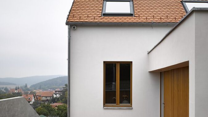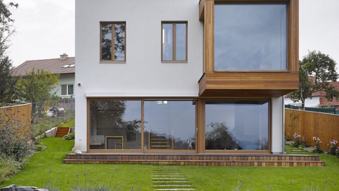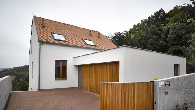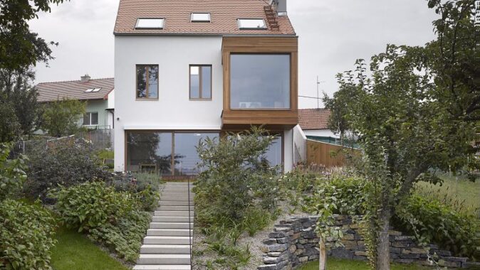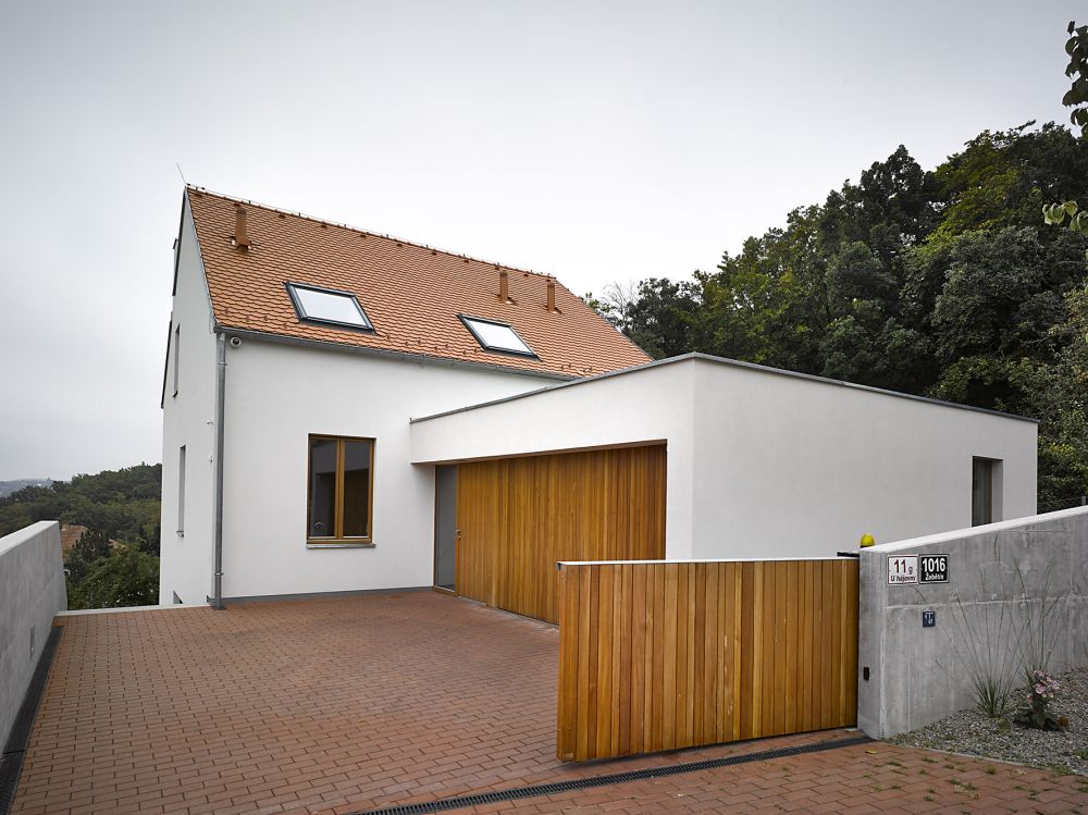 Základním mottem návrhu bylo „chytré“ usazení hmoty a dispozic stavby do svažitého terénu a její návaznost na zahradu a ulici. Návrh respektuje terén a co nejméně ho „znásilňuje“. Tvar domu je vymezen hranicí pozemku a je lehce lichoběžníkový. Jedná se o archetypální tvar, jednoduchou hmotu se sedlovou střechou. U fasády směrem do zahrady je kontrast k tradičním oknům vytvořen velkými prosklenými plochami a doplněn o jednoduchý box dřevěného proskleného arkýře.