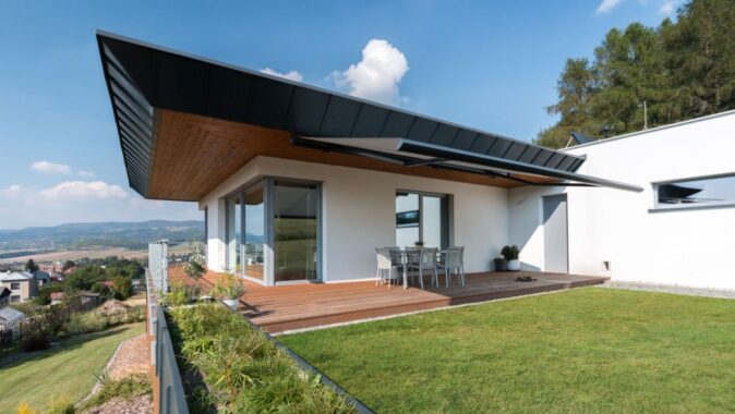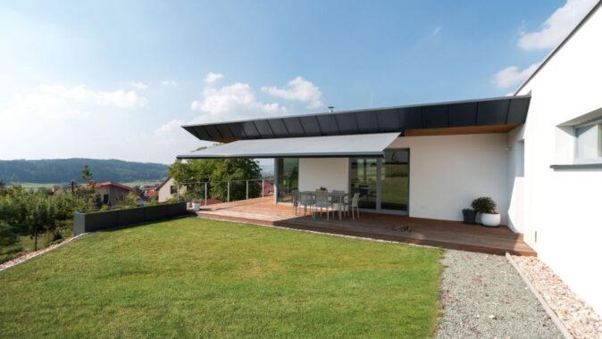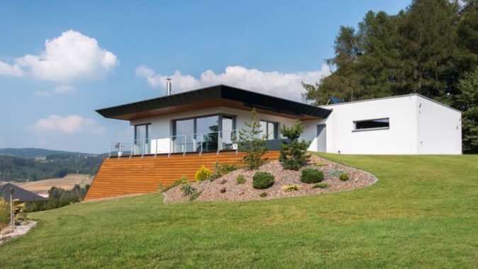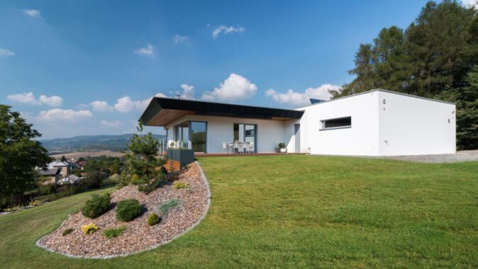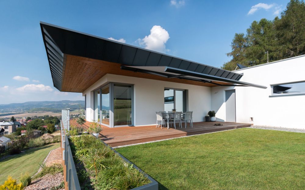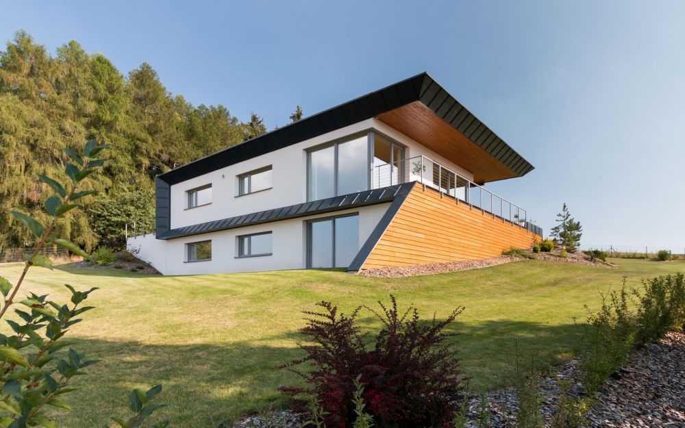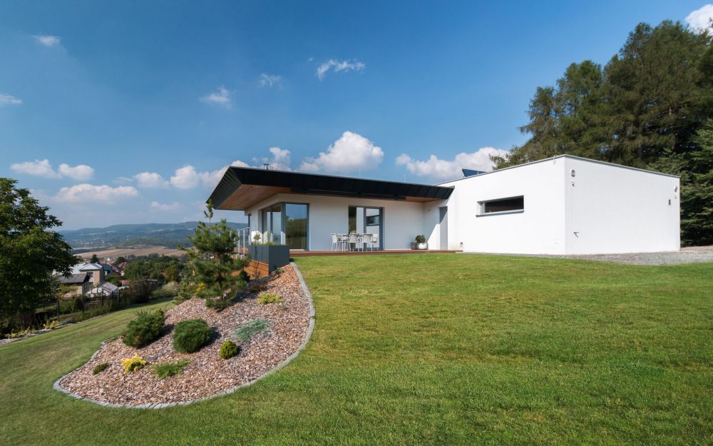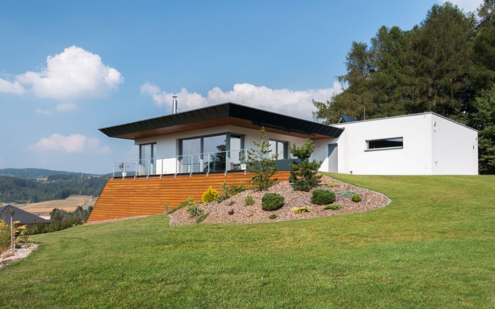Dům je umístěn na svažitém pozemku s krásným výhledem.