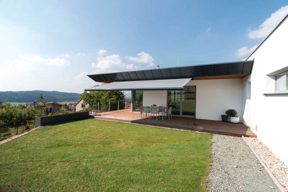 Převýšení pozemku činí 5,5 m. Koncept řešení určily výhled do kraje, severozápadní