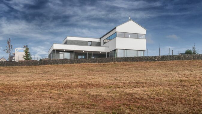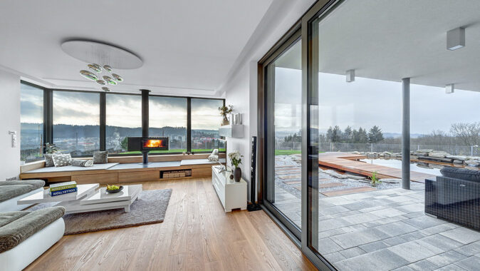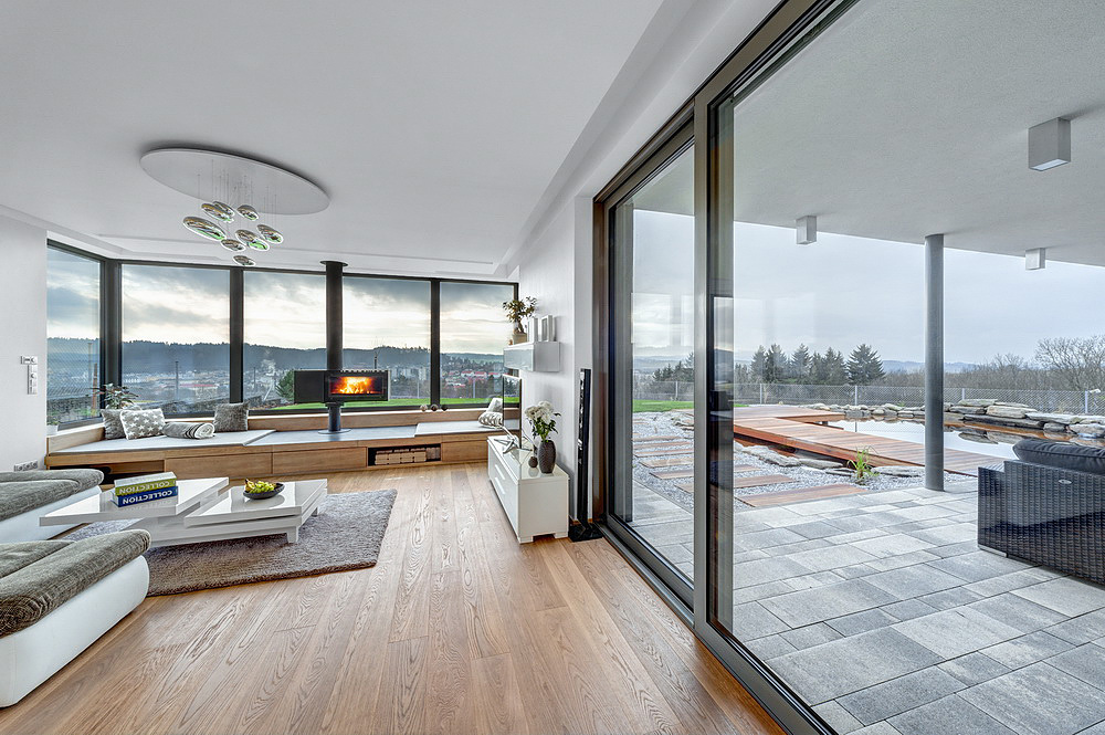 Pásové okno garáže, které navazuje na třístranné prosklení obývacího pokoje, má