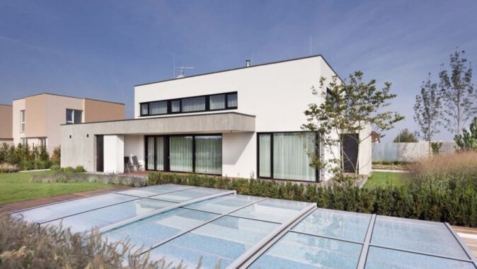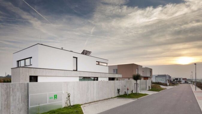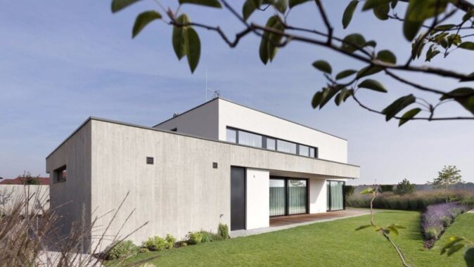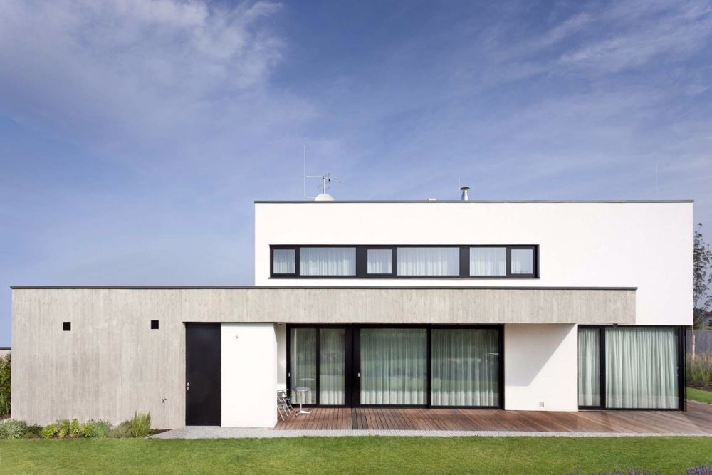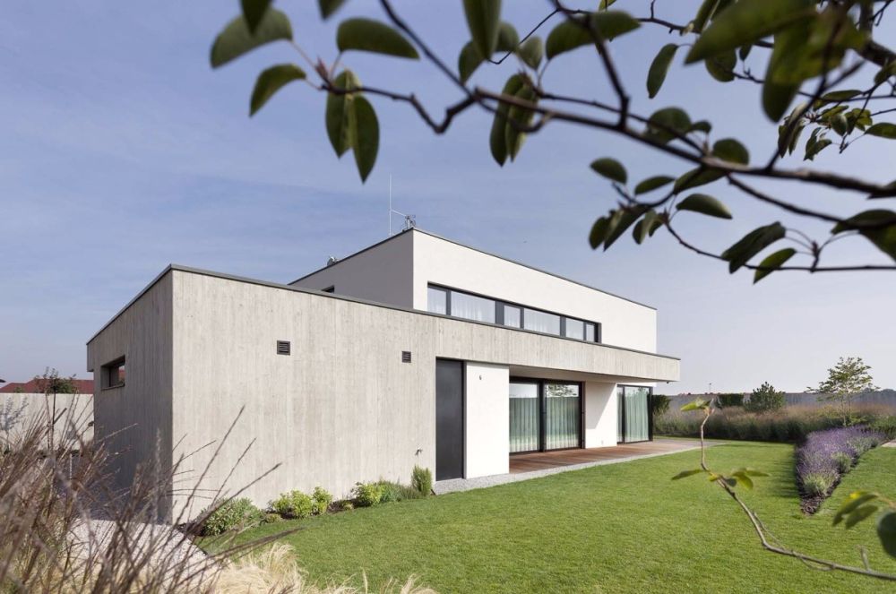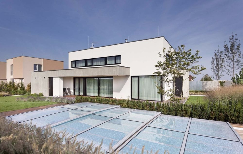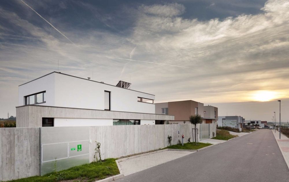 Přáním investora bylo navrhnout jednoduchou kompaktní stavbu s lehkým odkazem na funkcionalistickou architekturu. Na přibližně obdélníkovém půdorysu je koncipován dvoupodlažní dům pro čtyřčlennou rodinu. V přízemí se nachází hlavní obytné a technické prostory včetně garáže. Do patra jsou situovány pokoje a ložnice se zázemím. V úrovni přízemí dům navazuje na kvalitně založenou zahradu s bazénem.