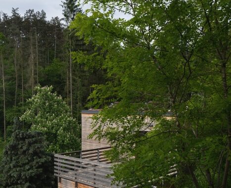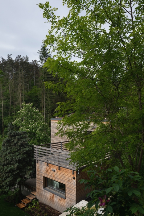 usazením i zvolenými materiály. Na fasádě je použit dřevěný obklad a střechy
