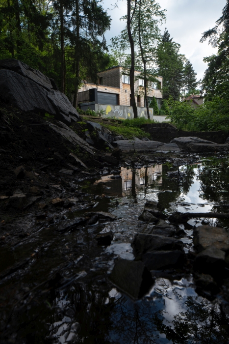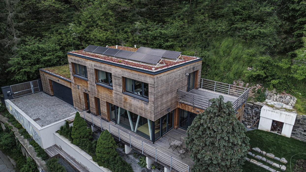 zahradu). Dům je v souladu s okolní přírodou a citlivě se do ní začleňuje svým