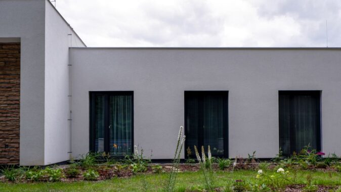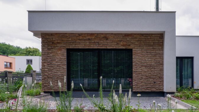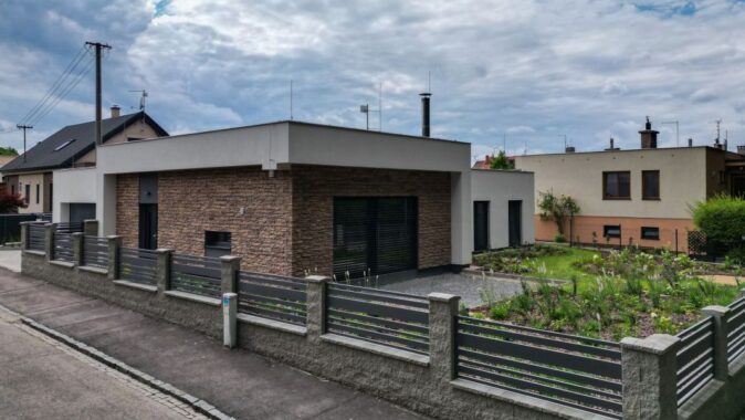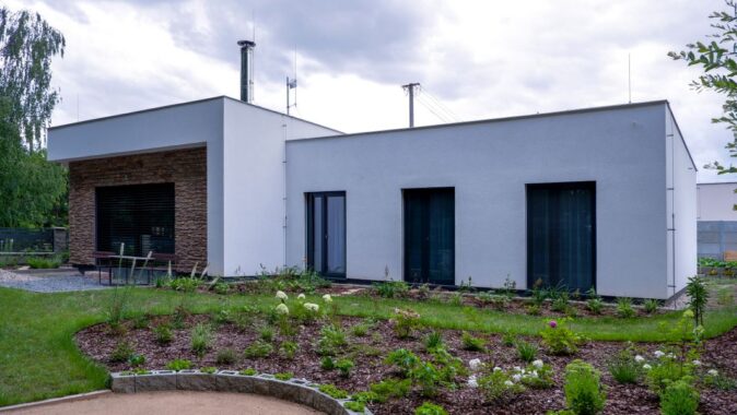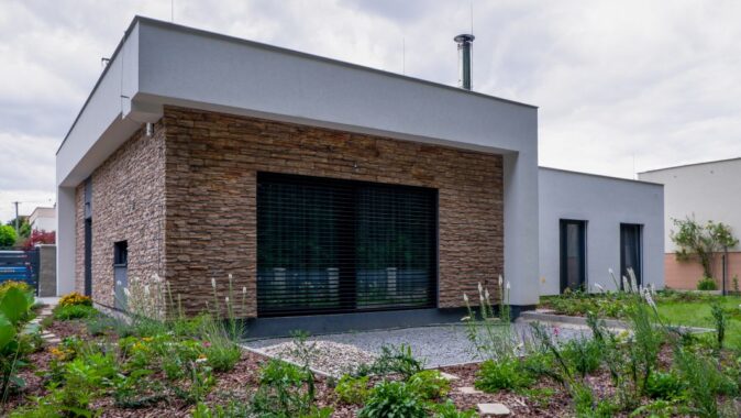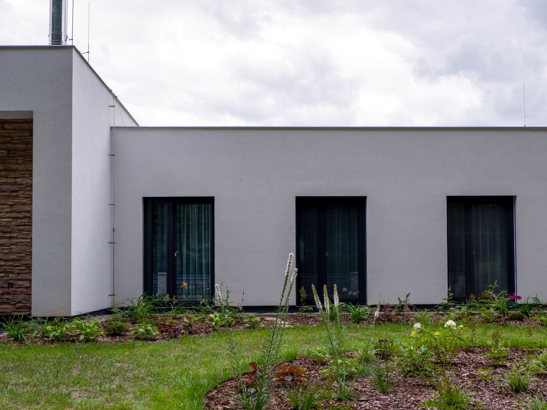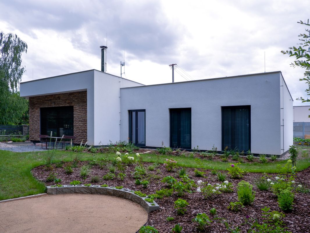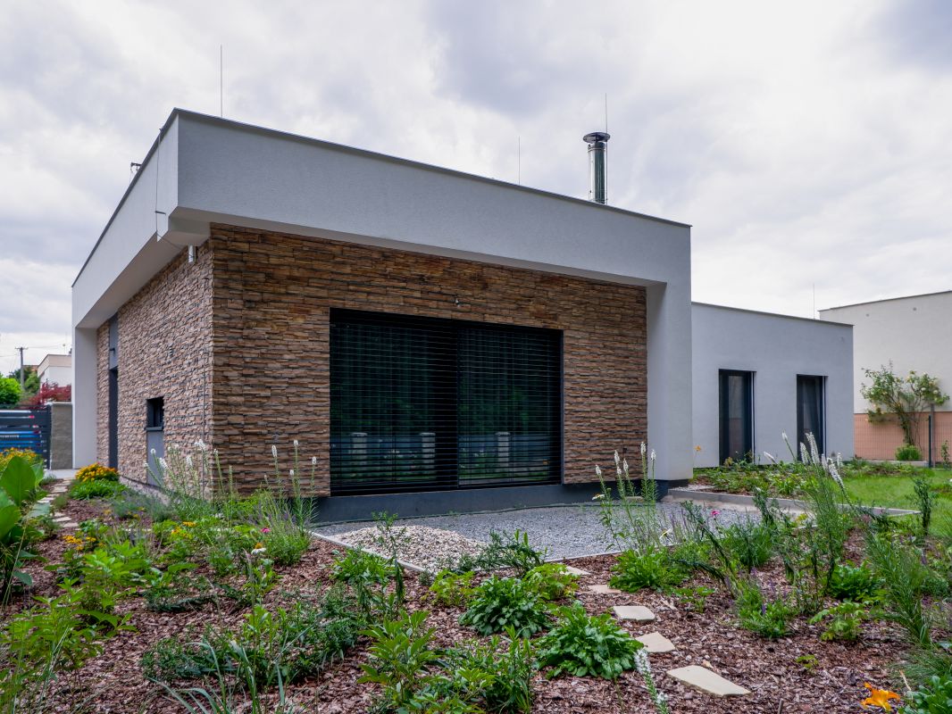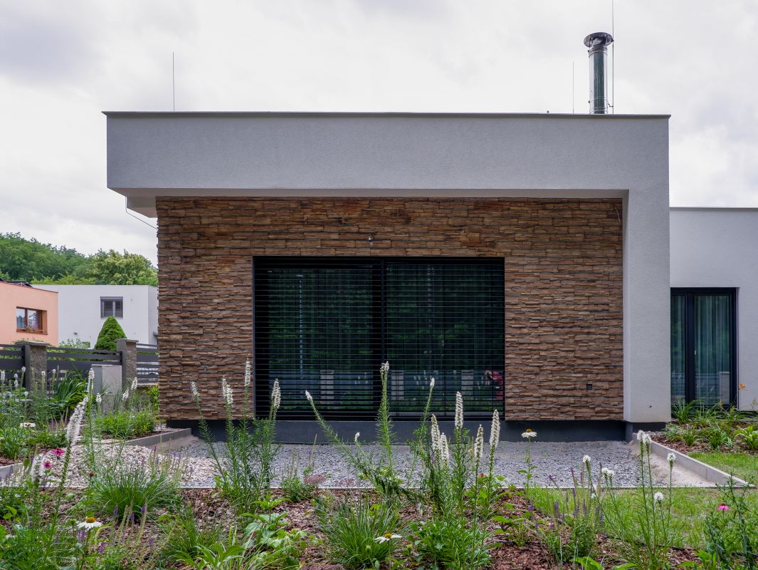 kombinací dvou materiálů – omítky v bílé barvě a světle béžového kamenného obkladu. Střecha rodinného domu je plochá, použita je kotvená hydroizolace.