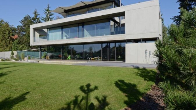 je pojednána jako těžký betonový kvádr na odlehčené, prosklené podnoži (1. NP).
