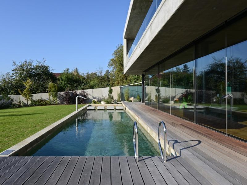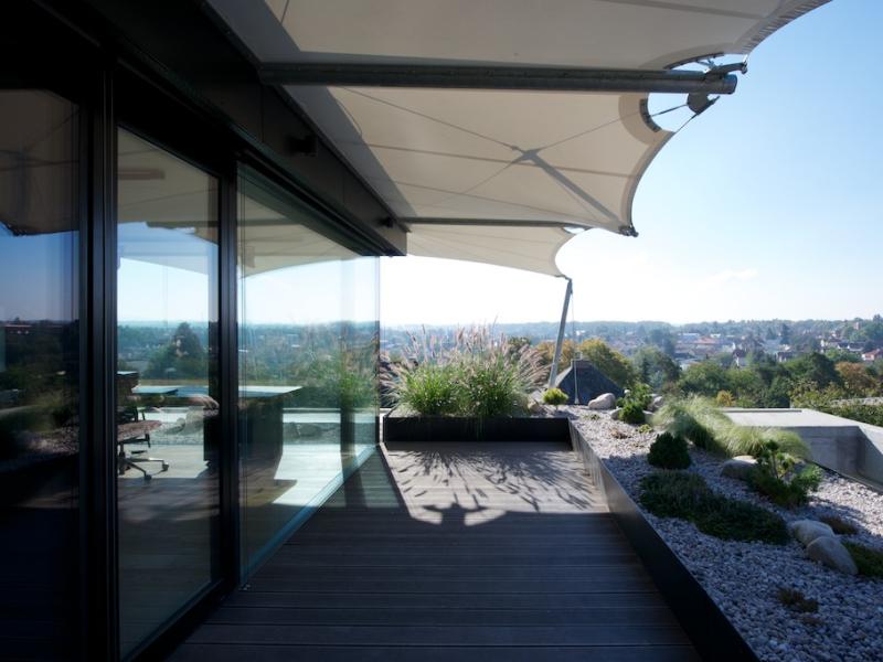 Dům má jedno podzemní podlaží, dvě nadzemní a malou pracovnu na horní střeše. 1. NP má obytný charakter, směrem do ulice je uzavřeno, do zahrady se masivním prosklením otevírá. 2. NP je klidovou zónou s ložnicemi, jeho půdorysná plocha přesahuje přízemí a vytváří tak kryté prostory a stínění. Pracovnu na střeše z lehké konstrukce jsme od hran objektu odsadili tak, aby byla pohledově maximálně potlačena.