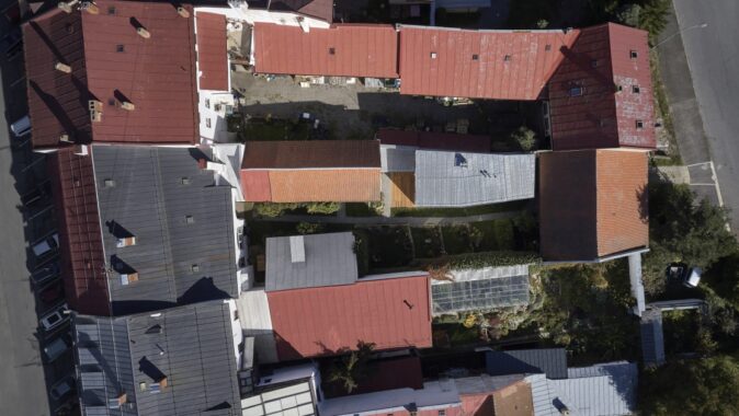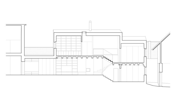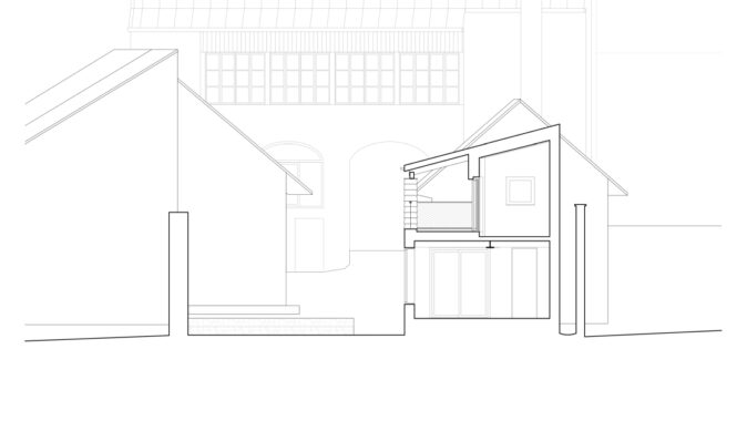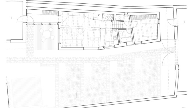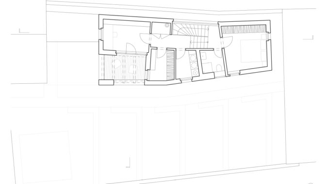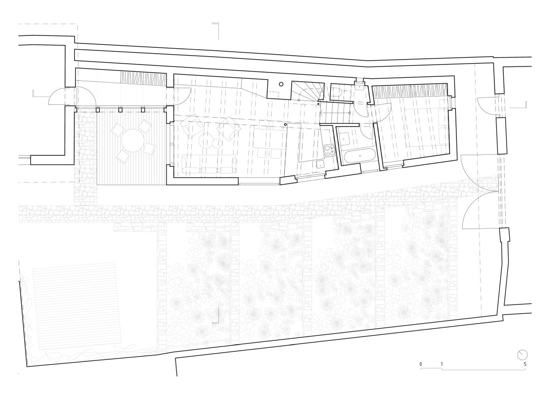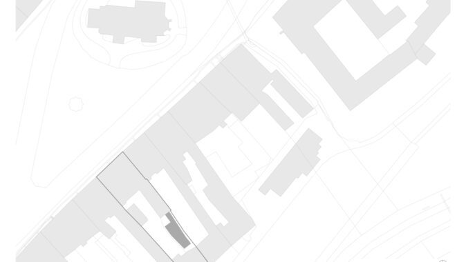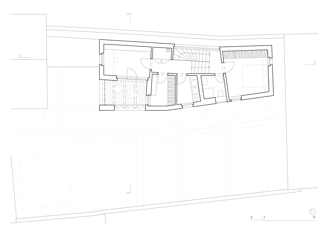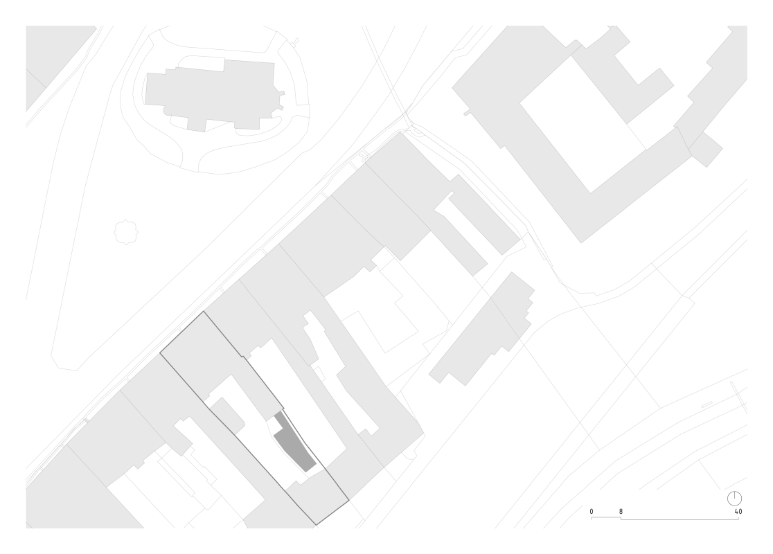 Návrh vychází z geometrie pozemku, jeho orientace vůči světovým stranám a také kontextu zástavby vnitřních dvorů v dané lokalitě. Proto byla pro stavbu zvolena poloha podél severovýchodní hraniční zdi v „proluce“ mezi stávajícím objektem původních chlévů a stodolou na jihovýchodní straně parcely v místě, které již v minulosti bylo zastavěno hospodářskými objekty. Toto osazení domu je výhodné také z hlediska oslunění obytných místností a teras. Stavba respektuje stávající trasy pohybu ve dvorové části, průjezdy a vstupy do stávajících objektů, resp. do dvora.