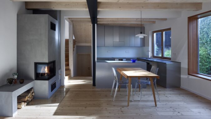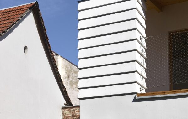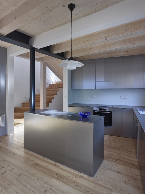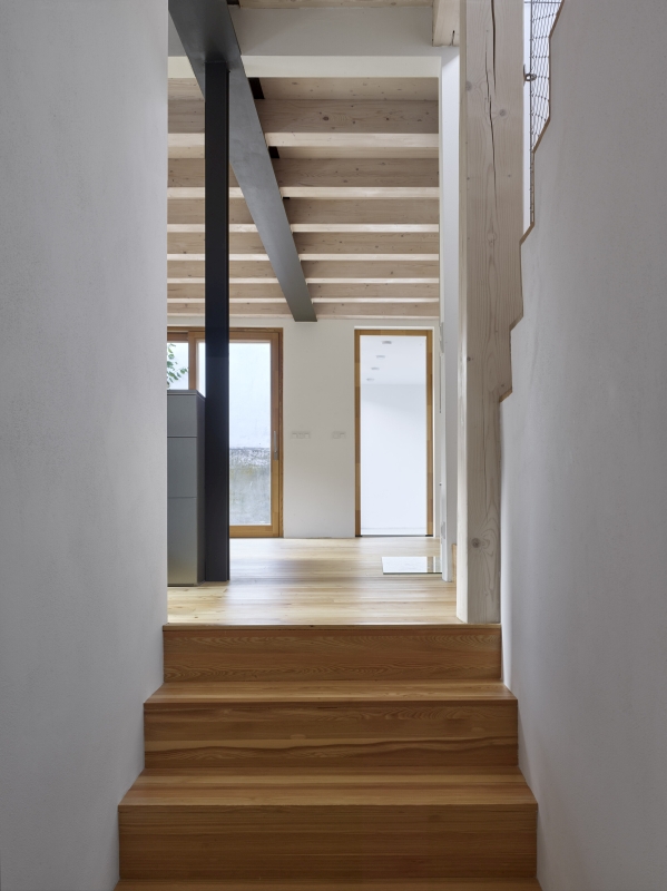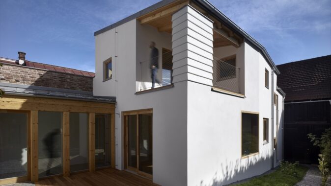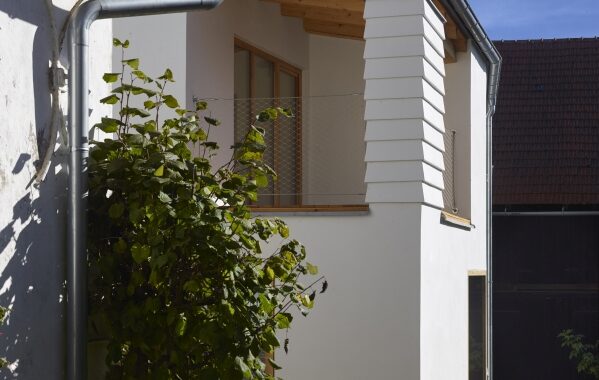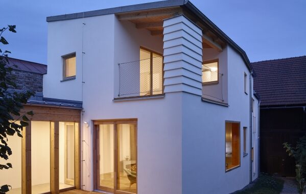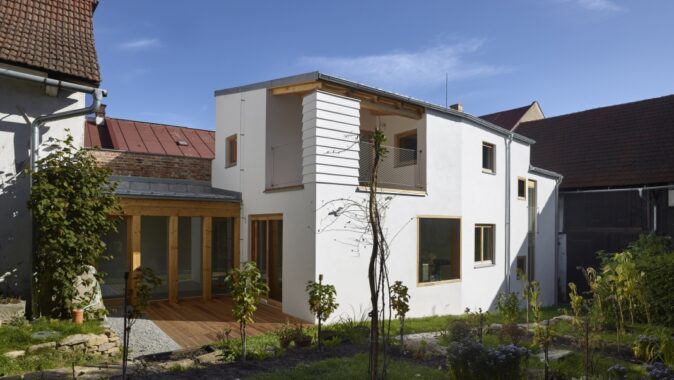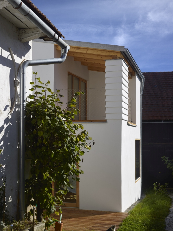 Základní materiálové řešení návrhu vychází z tradičních a místně používaných materiálů – dřevo, ocel, hlazená, režně bílá omítka, kámen, sklo. Přístavba je zastřešena pultovou střechou, spádovanou do dvora, a je omítnuta bílou hlazenou omítkou. Vzhledem k výraznějšímu spádování terénu ve dvoře je přístavba rozdělena do několika výškových úrovní, což umožňuje zmenšovat a členit hmotu domu, která se tak přirozeně přizpůsobuje morfologii terénu a snižuje ve směru spádu. Tímto principem je dům v prostoru vnitřního dvoru vnímán objemově menší. Vstupní část je řešena jako prosklený přízemní „krček“ spojující stávající objekt chlévů a novou přístavbu.