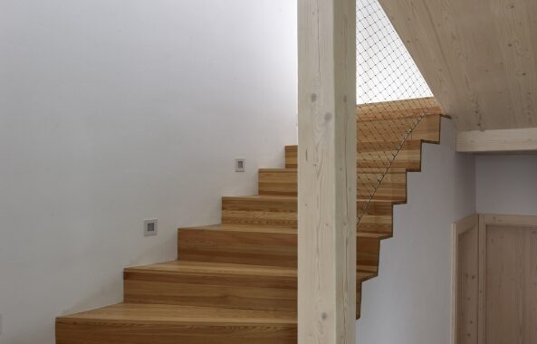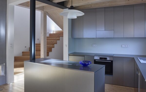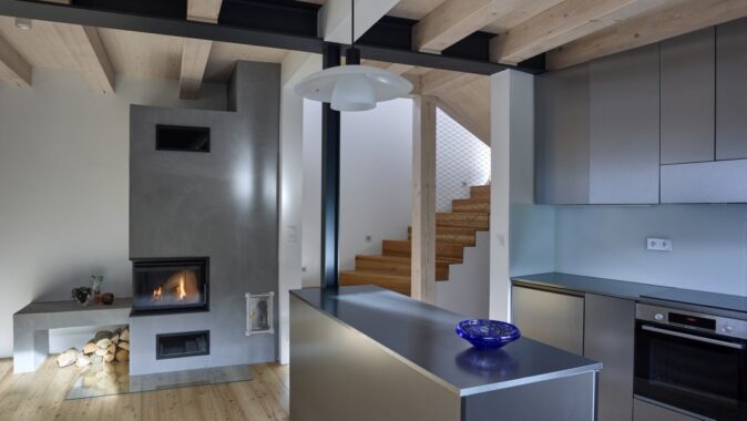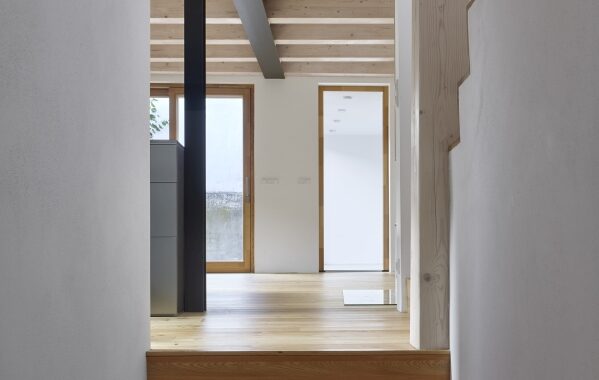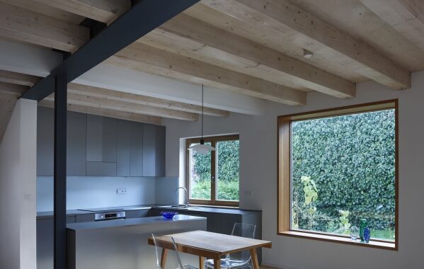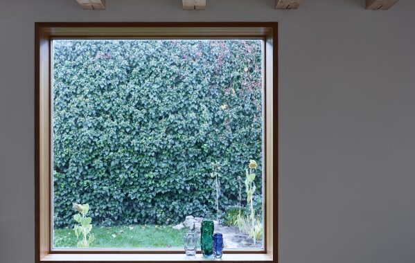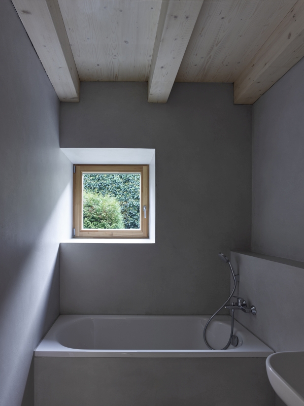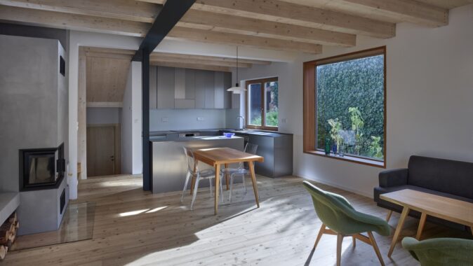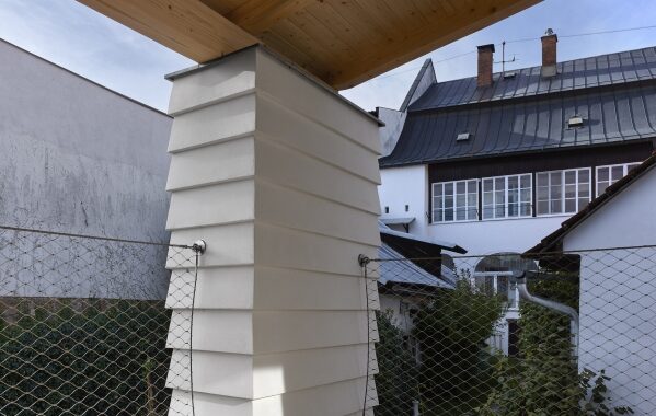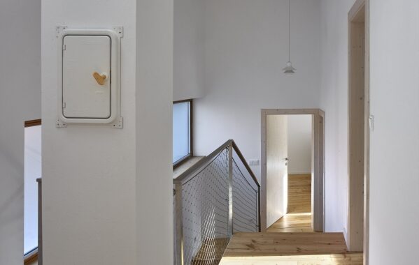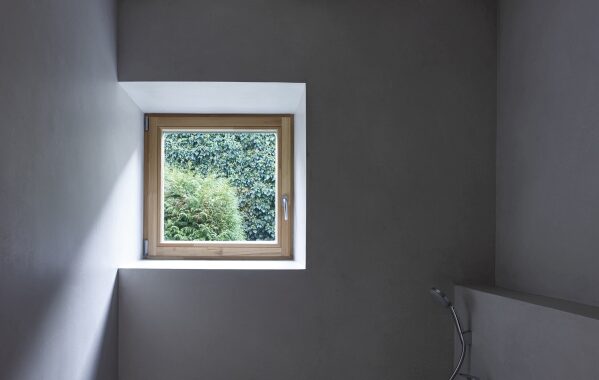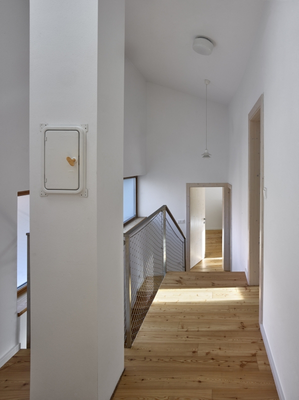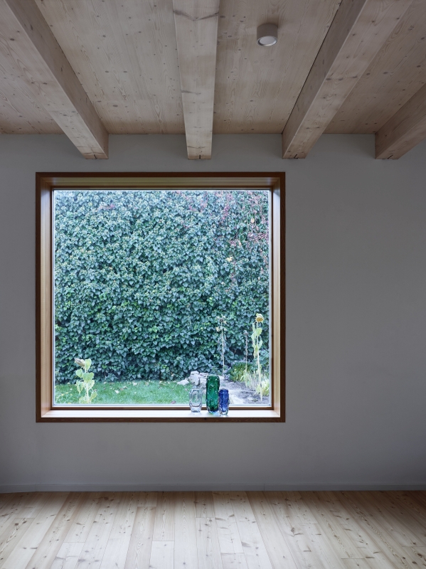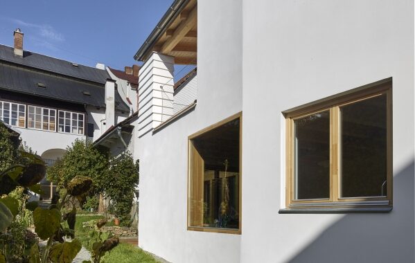 Okenní otvory jsou s rozvahou navrženy pouze v polohách, kde jsou důležité a opodstatněné. Jedná se o kompozici především čtvercových oken s různou pozicí v ostění tak, aby různorodost podpořila dojem vrstevnatosti a tvarové i konstrukční rozmanitosti místních dvorových staveb a stavbiček. Prosklené plochy v interiéru působí jako živé obrazy, měnící se dle ročních období a světelných podmínek. Současně přinášejí do interiéru důležitý světelný standard a hodnotné průhledy do exteriéru.