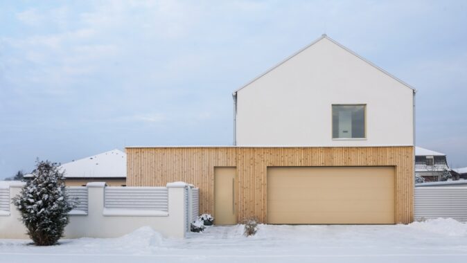 Vchod do domu vede z ulice; vstupní dveře jsou usazeny do dřevěného obložení. Podobně nenápadně působí vrata, kterými se vjíždí do integrované dvougaráže. Úzká chodba vede podél technické místnosti, toalety a pracovny, a ústí do otevřeného prostoru obývacího pokoje. Z chodby stoupají schody do horního patra s ložnicemi a koupelnami.