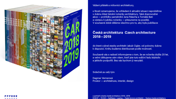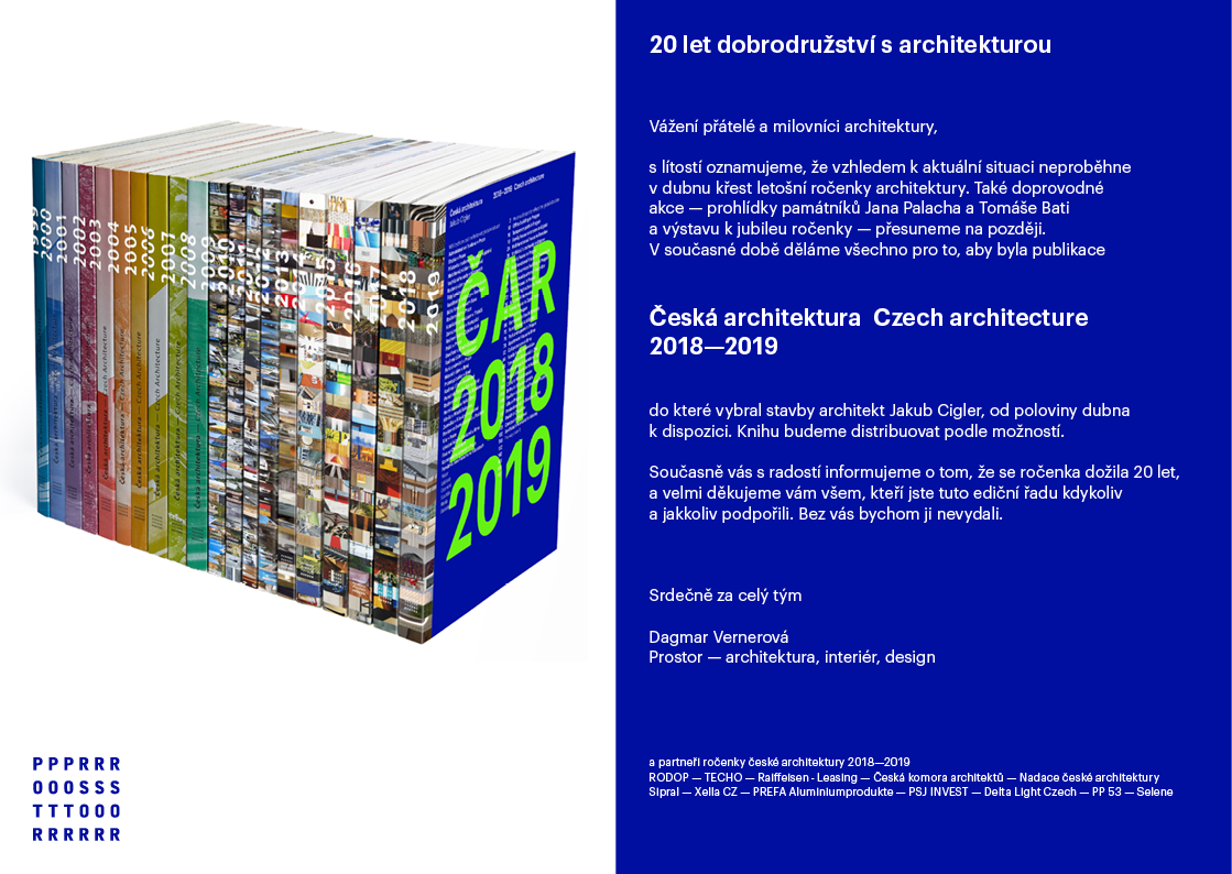 s lítostí oznamujeme, že vzhledem k aktuální situaci neproběhne v dubnu křest letošní ročenky architektury. Také doprovodné akce – prohlídky památníků Jana Palacha a Tomáše Bati a výstavu k jubileu ročenky – přesuneme na později. V současné době děláme všechno pro to, aby byla publikace Česká architektura 2018–2019 do které vybral stavby architekt Jakub Cigler, od poloviny dubna k dispozici. Knihu budeme distribuovat podle možností.