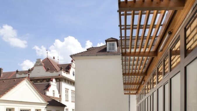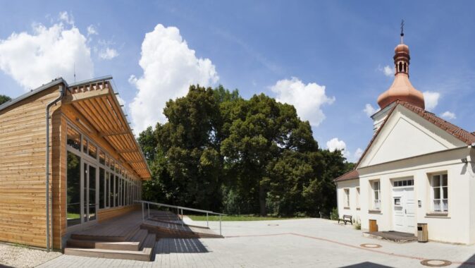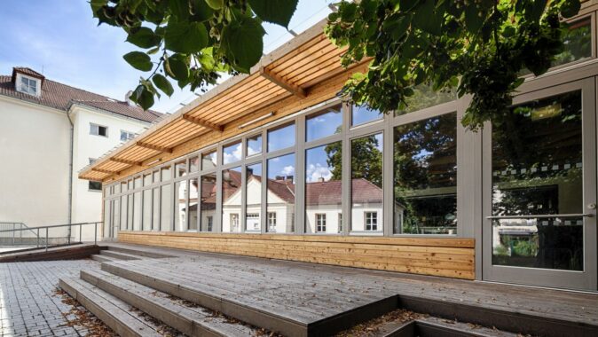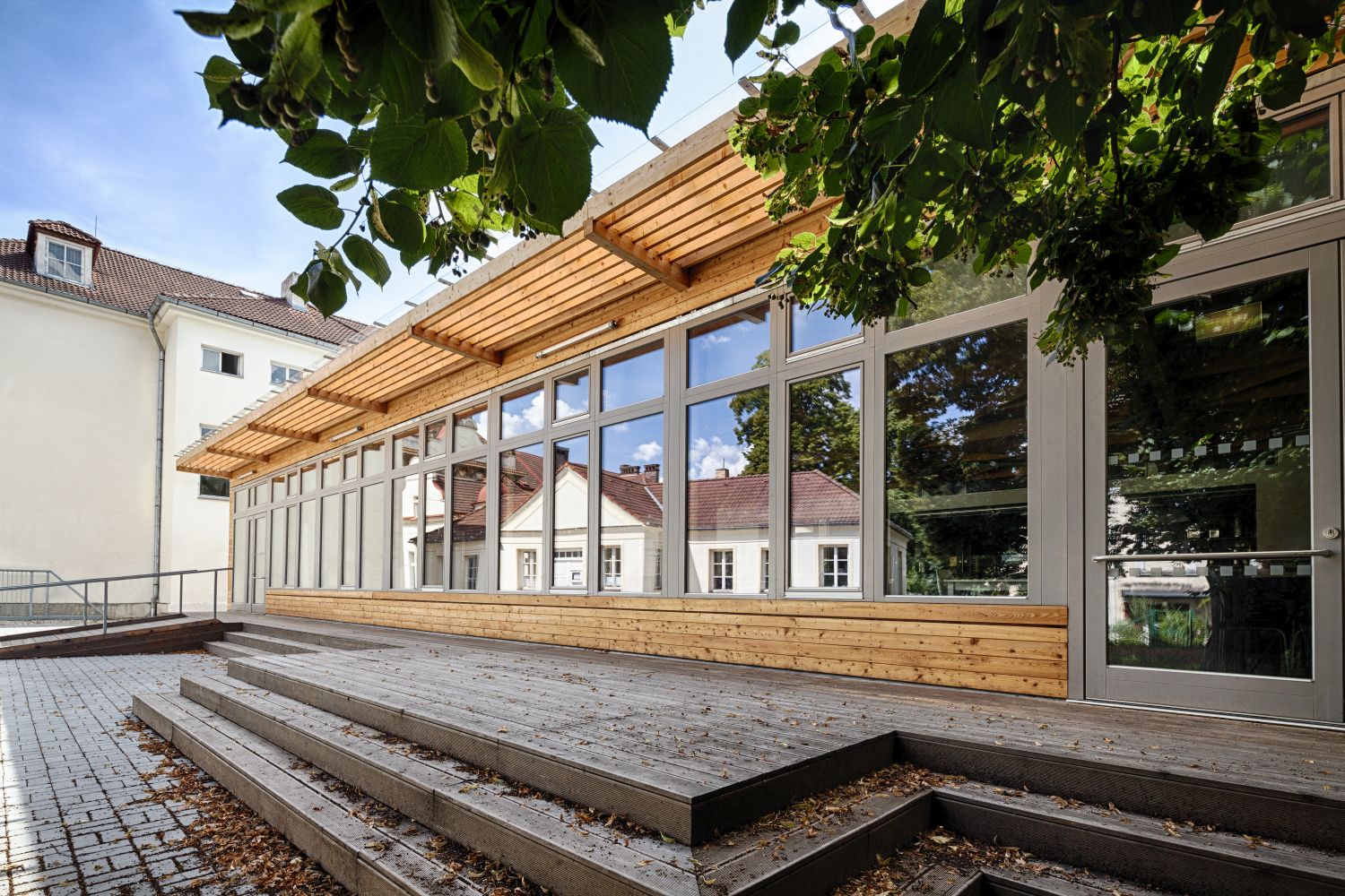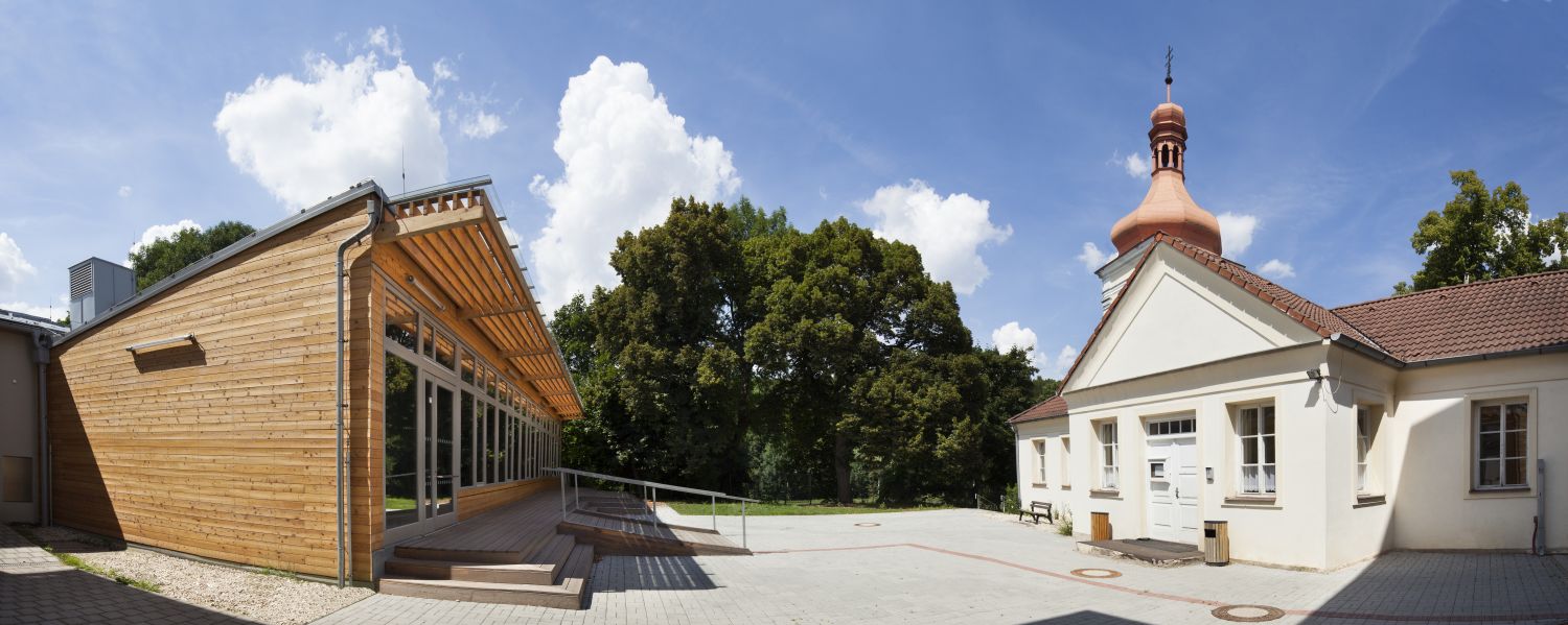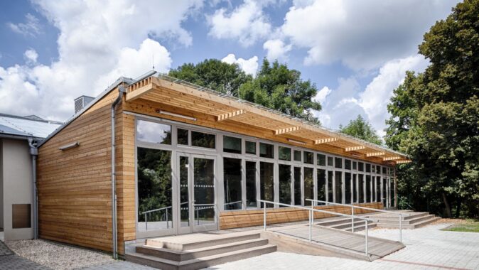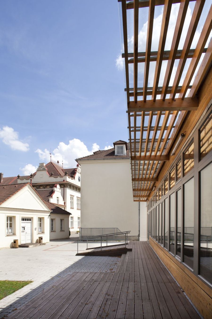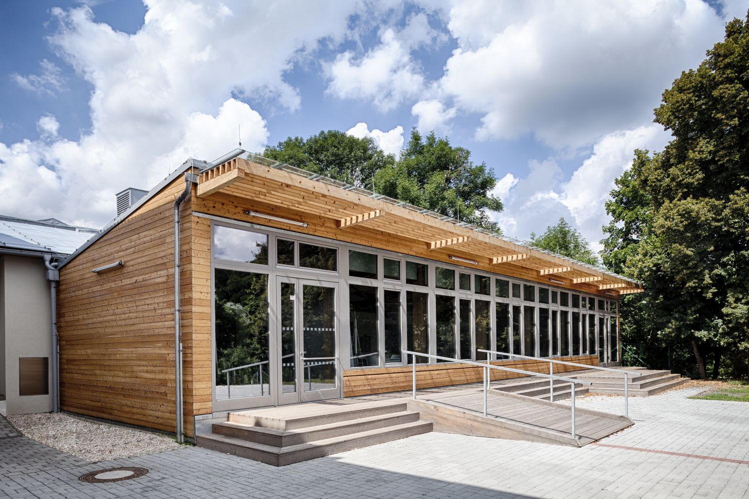 Autorka projektu nové školní jídelny vycházela ze snahy po úsporném, ale architektonicky i stavebně kvalitním provedení. Rozhodla se pro dřevostavbu, která jí v interiéru dovolila navrhnout přiznané konstrukční prvky střešního pláště.