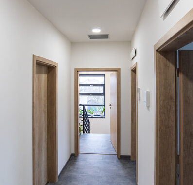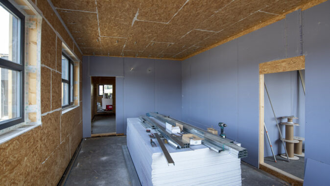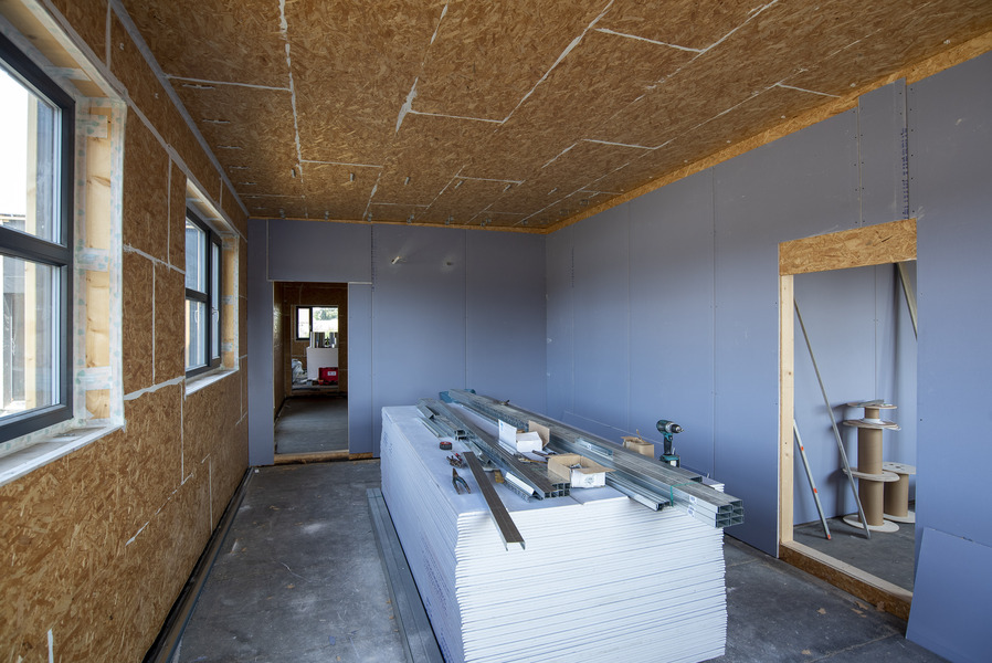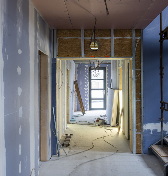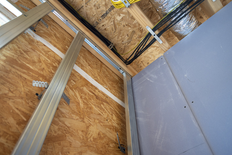 V přízemí předepisovalo požárně bezpečnostní řešení objektu REI 45 na všechny předstěny typu W 623 s přímými závěsy do OSB desky. Na dvojité opláštění se použily desky Knauf DIAMANT 12,5 mm s izolací na bázi čedičového vlákna s bodem tavení vyšším než 1000 °C a třídou reakce na oheň A1 dle požárního katalogu pro splnění požadavku EI45 min. DP1. Dvojité opláštění deskami DIAMANT se stalo současně zárukou perfektní stavební zvukové izolace. „Zvolili jsme styl stavby, kdy stěny jsou vyneseny odspodu nahoru a patra jsou do konstrukce vložená. Výška „stojek“ byla v podstatě 7 m. To znamená, že se postavila konstrukce celého objektu a do ní se vkládala patra. Vyztužil se věnec a na něm se postavily stropy. Takové řešení je pevnější,“ vysvětloval Petr Pimek.