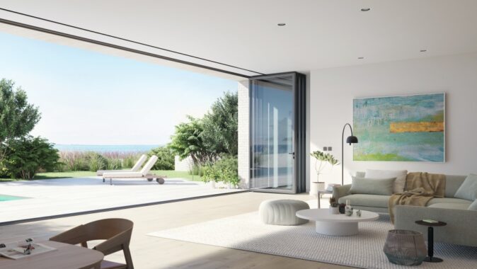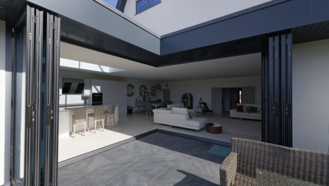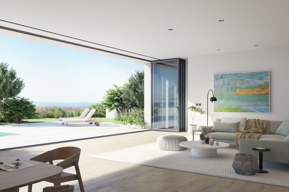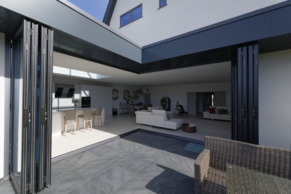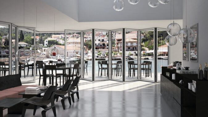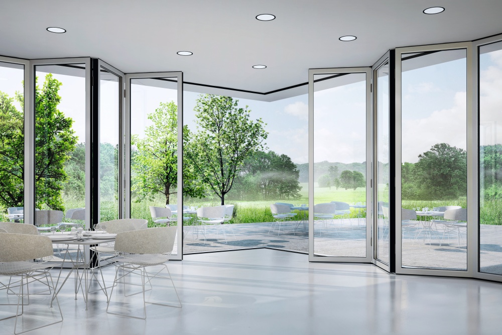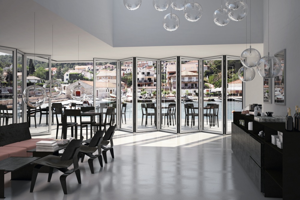 Jednotlivá křídla shrnovacího systému Schüco ASS 80 FD.HI mohou mít šířku od 50 do 120 cm a celkově z nich lze vytvořit dveřní systém až 16,8 m široký a 3 m vysoký. Křídla se posouvají velmi hladce po vodících kladkách v podlahových a stropních kolejnicích a lze z nich realizovat i impozantní ven či dovnitř otvíravý 90° roh. Designový systém je současně i praktický a „user friendly“, vytváří plochý podlahový práh s vysokou vodotěsností, který současně zajišťuje bezbariérový přístup. Systém lze dovybavit elegantními magnetickými zarážkami s odpovídající plochou dveřní klikou.
