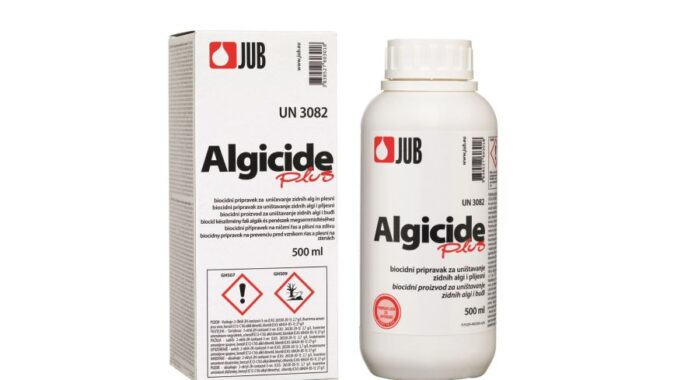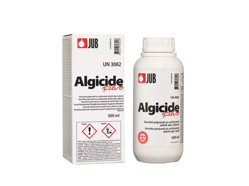 Po vyschnutí umyté fasády je třeba ji dezinfikovat, aby se odstranily řasy a plísně. K tomu použijte speciální biocidní prostředek JUB ALGICIDE Plus. Tento bezbarvý roztok proniká hluboko do podkladu a ničí široké spektrum řas a plísní. Neobsahuje chlor a nezasoluje podklad. Nařeďte ho s vodou v poměru 1 : 5 a naneste štětcem nebo válečkem. Na silně zasažené povrchy naneste dva nátěry. Biocidní nátěr se neomývá a zaschlý je zdravotně nezávadný. Přípravek se nikdy nepřidává do barev nebo omítek!