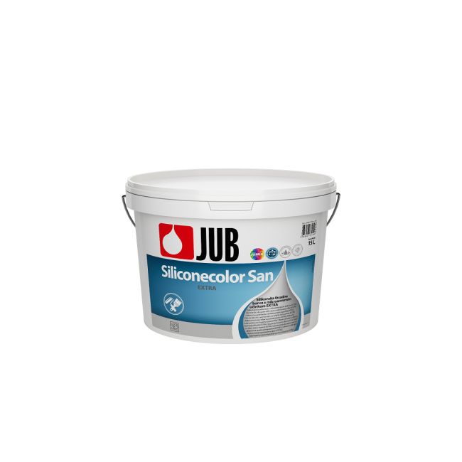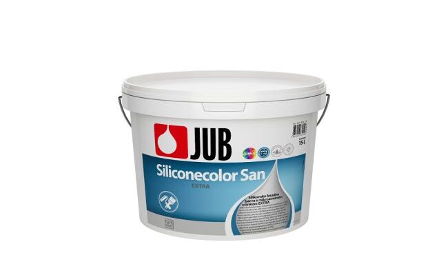 Posledním pracovním postupem je nátěr fasády speciální barvou JUB SILICONECOLOR San EXTRA . Tato vodou ředitelná mikroarmovaná fasádní barva má vysoký podíl silikonových pojiv a obsahuje účinné biocidní přísady. Díky tomu je odolná proti řasám a plísním, zakrývá trhliny do 0,3 mm a nepraská ani v místech s hrubým povrchem. Barva je také vodoodpudivá, paropropustná, odolná proti povětrnostním vlivům a méně náchylná k zašpinění. Nanáší se zpravidla ve dvou vrstvách malířským válečkem nebo štětcem. Druhou vrstvu je možné nanést asi po 6 hodinách. Barvu lze namíchat do stovek barevných odstínů.