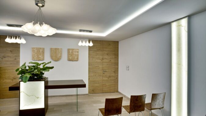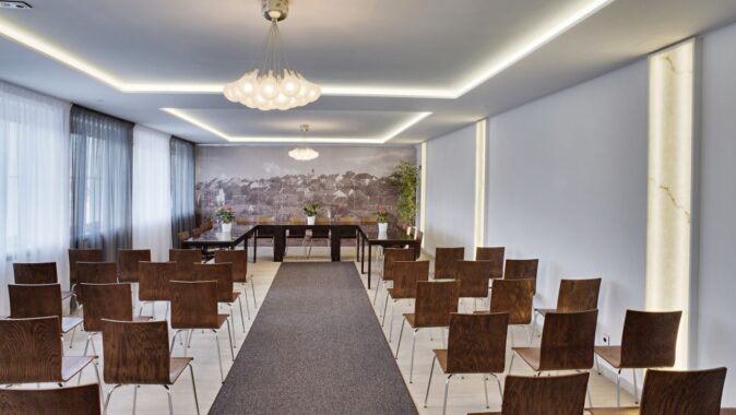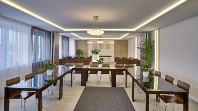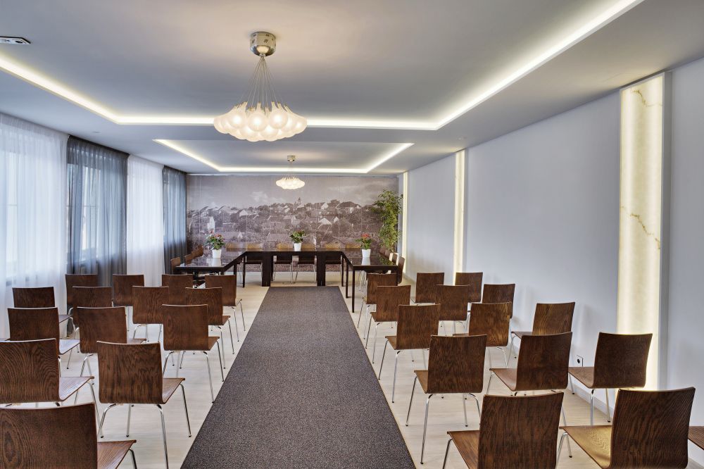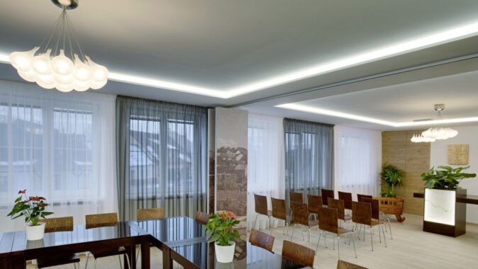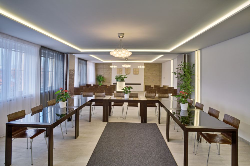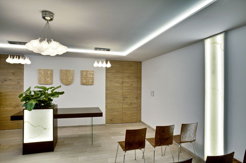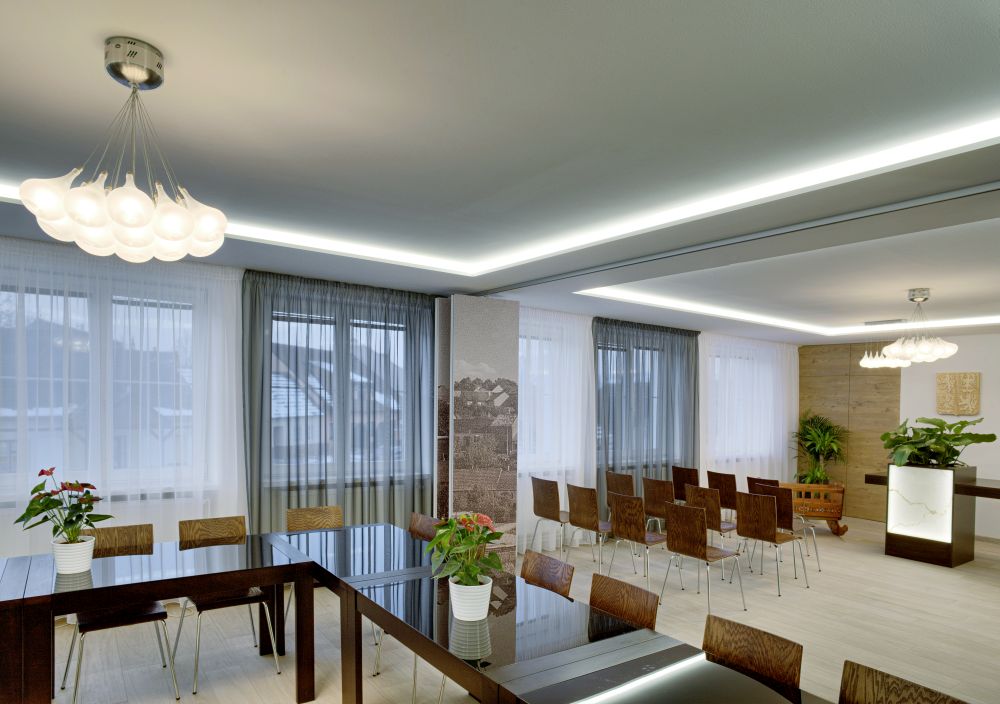 Obdélníkovou dispozici, která vznikla propojením obou místností, jsme opticky rytmizovali nástěnnými světly z akrylátových desek v imitaci mramoru a střídáním grafitových a ledově bílých závěsů z organzy. Pro podpoření zón v místnosti (řečnický pult, zasedání zastupitelstva, obecenstvo) jsme strop rozčlenili na bazény ze sádrokartonu, které jsou nepřímo nasvětlené led pásky.