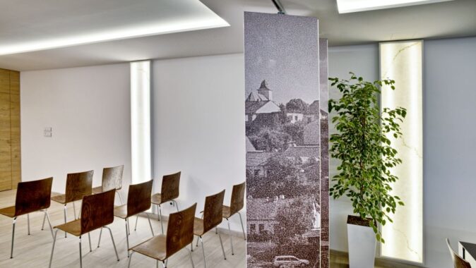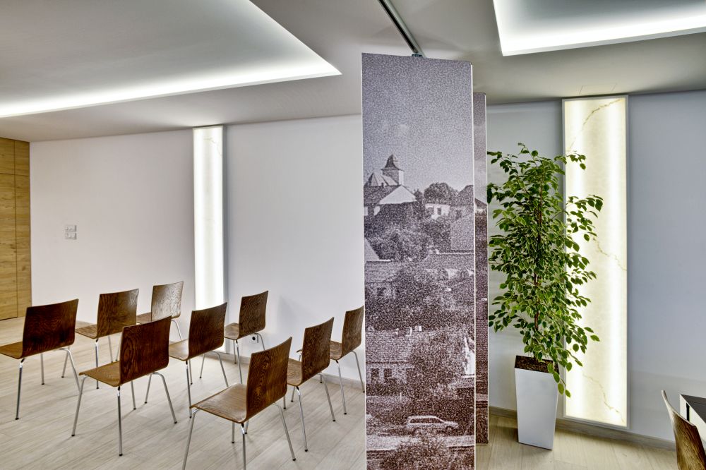 Řešili jsme rekonstrukci dvou sousedních sálů na obecním úřadě v Bořeticích, které slouží pro zasedání zastupitelstva, vítání občánků nebo pořádání svateb. Základním požadavkem bylo spojit tyto dvě místnosti tak, aby se zde mohly konat akce o větším počtu lidí. A zároveň mít možnost opět místnost rozdělit na dvě a vytvořit komornější atmosféru. Toho jsme docílili posuvnými stěnami z laminátových bílých desek, které jsou z jedné strany polepené velkoformátovou fotografií. Mobilní stěna se jednoduše shrne na jednu stranu ke zdi a vytvoří tak opticky celistvý prostor.
