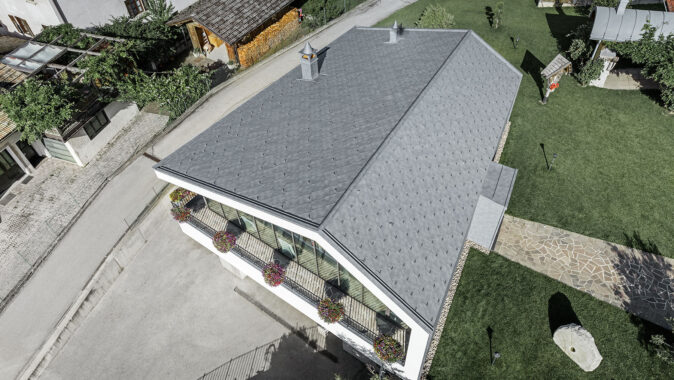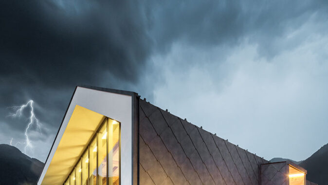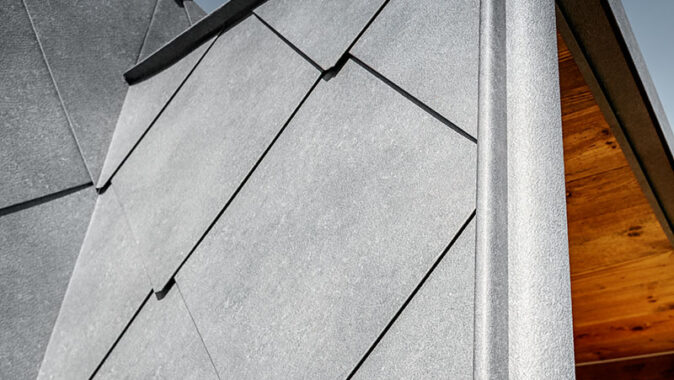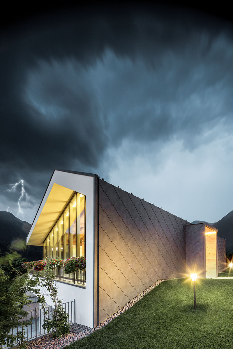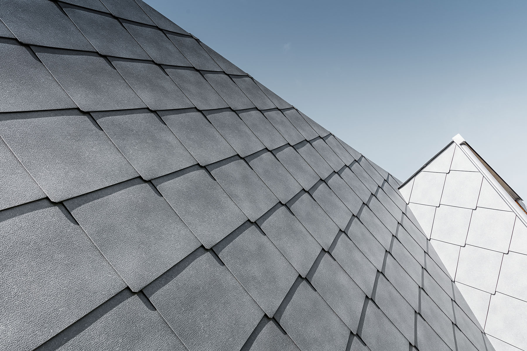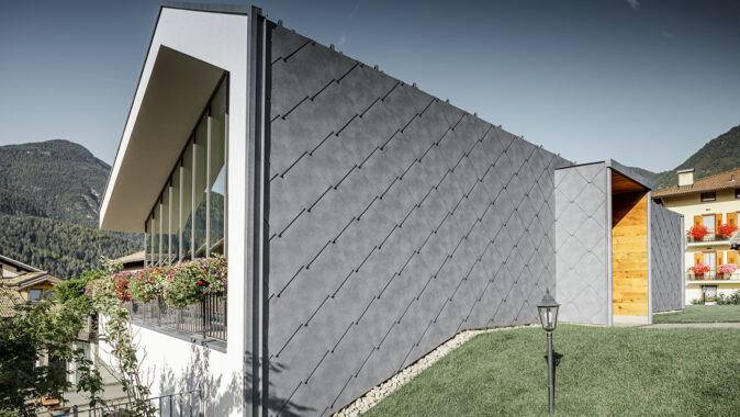 CC: Byla to ideální střešní krytina a fasádní obklad, s žádnou jinou bychom nemohli náš koncept takto realizovat. Kvůli nelineárnosti budovy byla velkou výzvou pokládka střešních šablon, protože střecha a fasáda měly tvořit jednotný celek. A tento jednotný celek mohl vzniknout pouze opticky nepřerušenou pokládkou střešních a fasádních šablon, což bylo možné výhradně se systémem PREFA. Teď to působí jako druhá kůže, jako druhý obal, napnutý nad horským hřbetem.