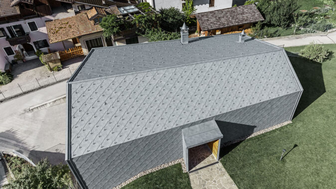 Busetti pokládal střešní šablony od hrany, od průsečíku střechy a fasády. „PREFA byl jediný systém, který umožňoval takové individuální řešení, jako je bezešvá pokládka střešních šablon. V žádném případě jsem nechtěl střešní šablonu odříznout u hrany. Řešením bylo ohnout ji na přechodu přes hranu, aby střecha a fasáda tvořily opticky jeden celek. Nebyly nutné ani dešťové žlaby pro odvodnění střechy, protože voda může jednoduše stéci po stěně“, říká. Busetti se nerozhodl pro pravoúhlý ohyb, ale pro zaoblení kolem hrany, s ohnutím uprostřed. „PREFA má tu výhodu, že díky kvalitě materiálu není nutná žádná údržba. A její šablony jsou jedněmi z mála, kterými lze pokrývat střechy i obkládat fasády. V případě neobvyklého salónu krásy v Livu tedy optimální řešení,“ zdůrazňuje Adriano Busetti.