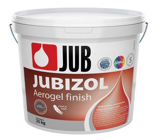 Alternativně lze pro JUBIZOL Premium použít jako vrchní dekorativní omítku JUBIZOL Aerogel finish. Tato vylepšená mikroarmovaná silikonová hlazená omítka je ideální pro pasivní a nízkoenergetické budovy, kde je zvláště důležitá trvalá a účinná tepelná izolace. Hodí se na všechny povrchy, které jsou více mechanicky zatížené nebo vystavené vyšší vlhkosti a dešti. Omítka je zušlechtěná aerogelem a speciálními plnivy z pěnového skla, které zvyšují izolační schopnosti a předchází tak přehřívání základní omítky i riziku vzniku prasklin. Inovativní hybridní technologie, kombinující karbonová a čedičová vlákna, poskytuje omítce vyšší pevnost a pružnost současně. Podobně jako omítka JUBIZOL Nano finish S omezuje trvalou vodoodpudivostí kondenzování vlhkosti na fasádním povrchu, což snižuje riziko vzniku řas a plísní. Současně nabízí vysokou paropropustnost a odolnost proti nepříznivým povětrnostním vlivům.