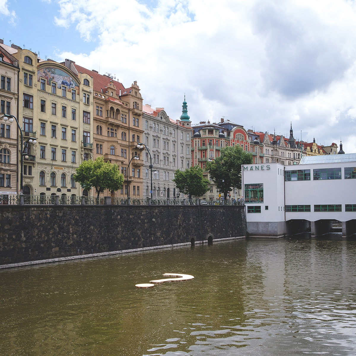 Cordera v Baarově parku v Michli, sedmimetrový Otazník na hladině Vltavy