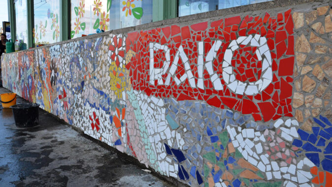 Mozaiky vyskládané z pestrobarevných keramických střípků