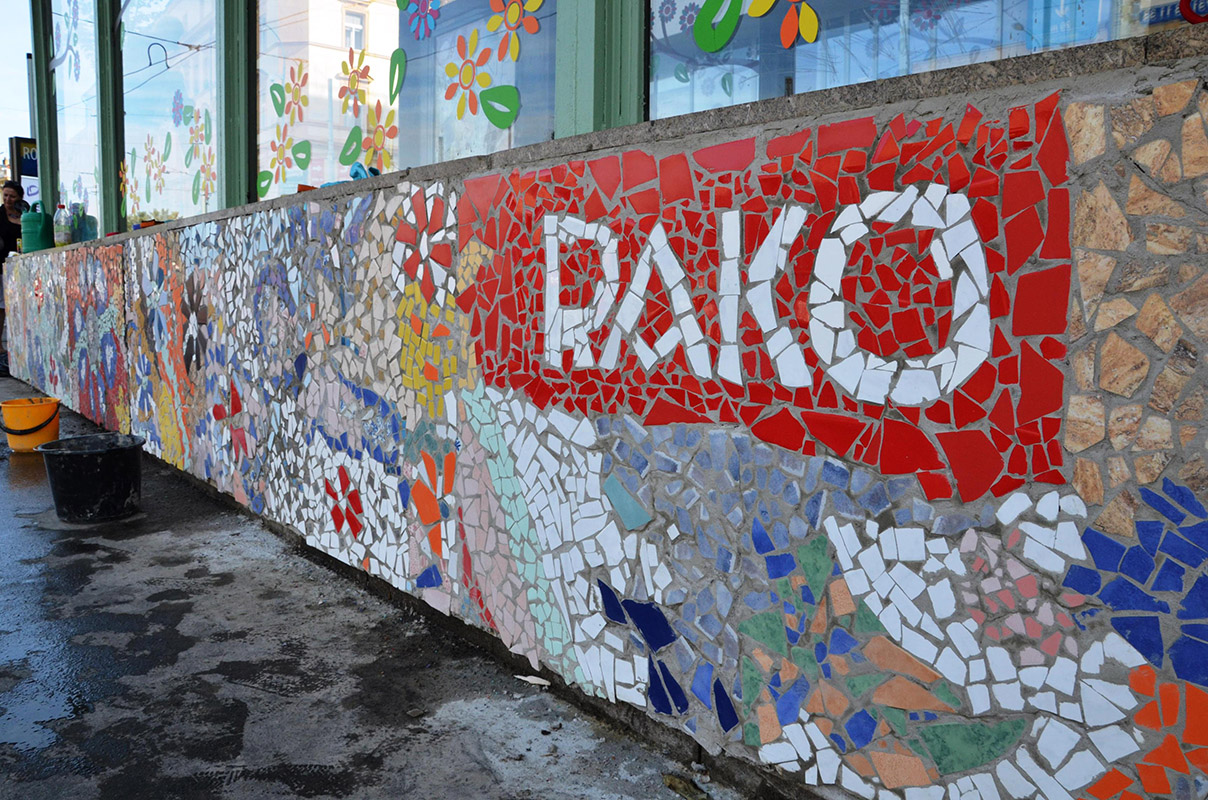 chemií. Na obří betonový květináč se mozaika lepila na místě, základ další