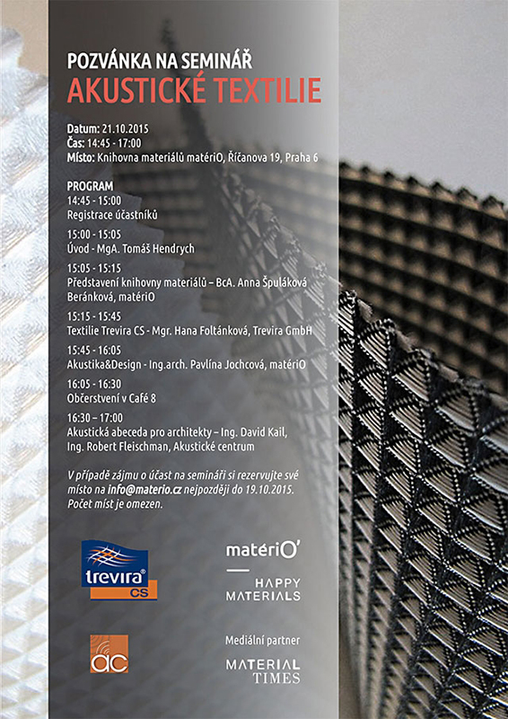 Účast na semináři je bezplatná, je však nutná registrace na info@materio.cz nejpozději do 19. října 2015. Počet míst je omezen.