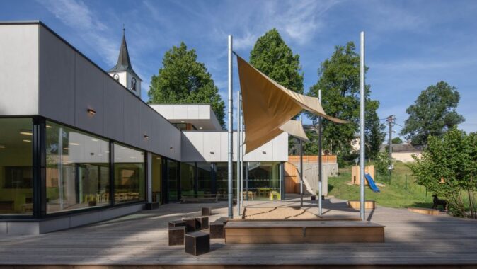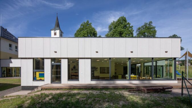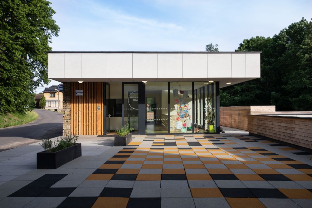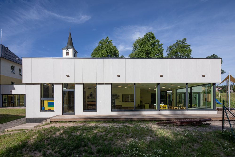 Chtěli jsme vytvořit prostor, kde bude dostatek světla, aby děti cítily nejenom tvůrčí svobodu, ale byly blízko přírodě, mohly vyběhnout ven a hrát si na čerstvém vzduchu. Také jsme si velmi přáli zkultivovat historický střed naší obce. Architektonicky jej tvoří fara, škola, kostel, zeď hřbitova a lipová alej. Proto jsme stavbu navrhli tak, aby působila spíše nenápadně a nebránila výhledu na les.