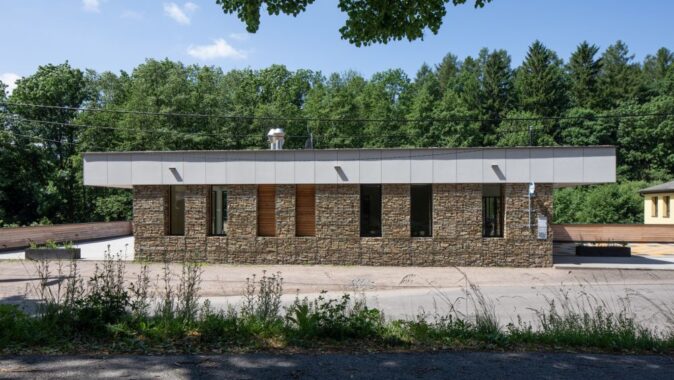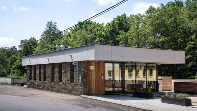Vstup do školky s velkým přesahem střechy je zároveň místem, kde je možné ukrýt se před deštěm při čekání na autobus. Střechu školní jídelny jsme navrhli tak, aby lákala děti čekající na autobus, aby neběhaly po silnici. Materiály vstupní stavby školky jsme volili s ohledem na okolí. Pískovcová gabionová zeď je zrcadlem pískovcové zdi hřbitova. Béžová barva obkladu odkazuje na barevné provedení kostela. Dřevěný obklad, který necháváme přírodně zestárnout, je odkazem na dřevěné hospodářské části fary. Střecha, osázená sukulenty, se bude při pohledu ze hřbitova ztrácet oproti okolní vegetaci.