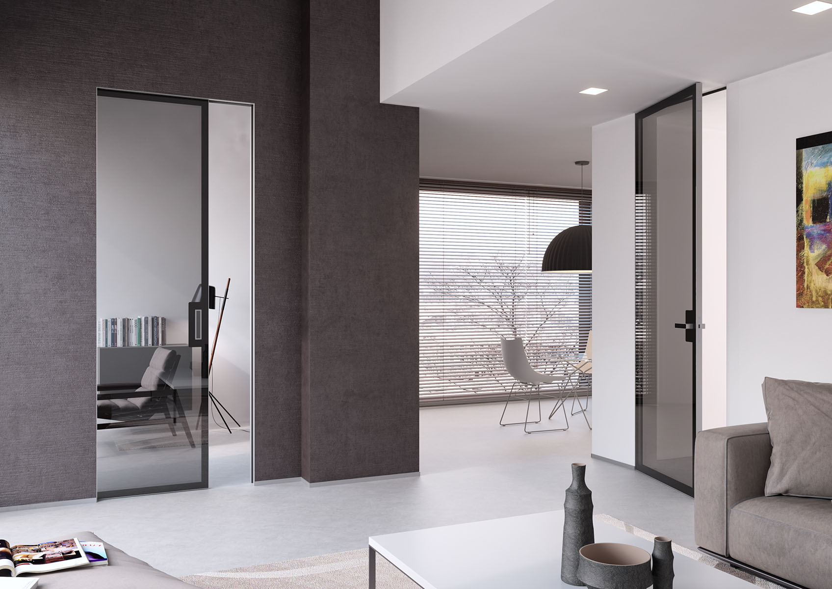 Skryté zárubně jsou určeny pro dveře otočné. V případě volby dveří zasouvajících se do stavebního pouzdra lze rovněž zvolit bezobložkové provedení, a to v podobě bezobložkových stavebních pouzder AKTIVE a EMOTIVE. Jednotný design interiéru je tak možné zachovat i při kombinaci obou typů otevírání dveřního křídla.
