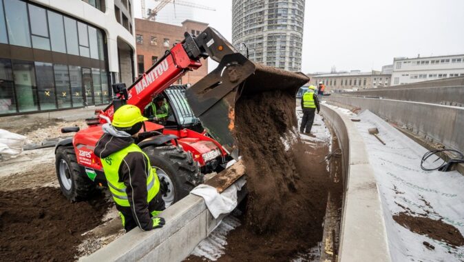 Geotextilie spolehlivě ochrání nopovou strukturu proti zanesení po provedení zásypu. Díky tomu nedochází k snížení hydroakumulační ani drenážní funkce vegetační střechy, která je nevyhnutelná pro udržení optimální vlhkosti substrátu. Matúš Motko ze společnosti Konti, a. s., která prováděla stavební práce na projektu SKY PARK, si práci s materiálem pochvaluje: „Práce s fólií není náročná. Zvládne ji i amatér. Prvky není třeba kotvit do podkladu, stačí je přitížit násypem. Díly do sebe zapadají, proto je jejich samotné spojování jednoduché.“
