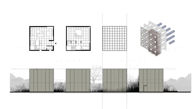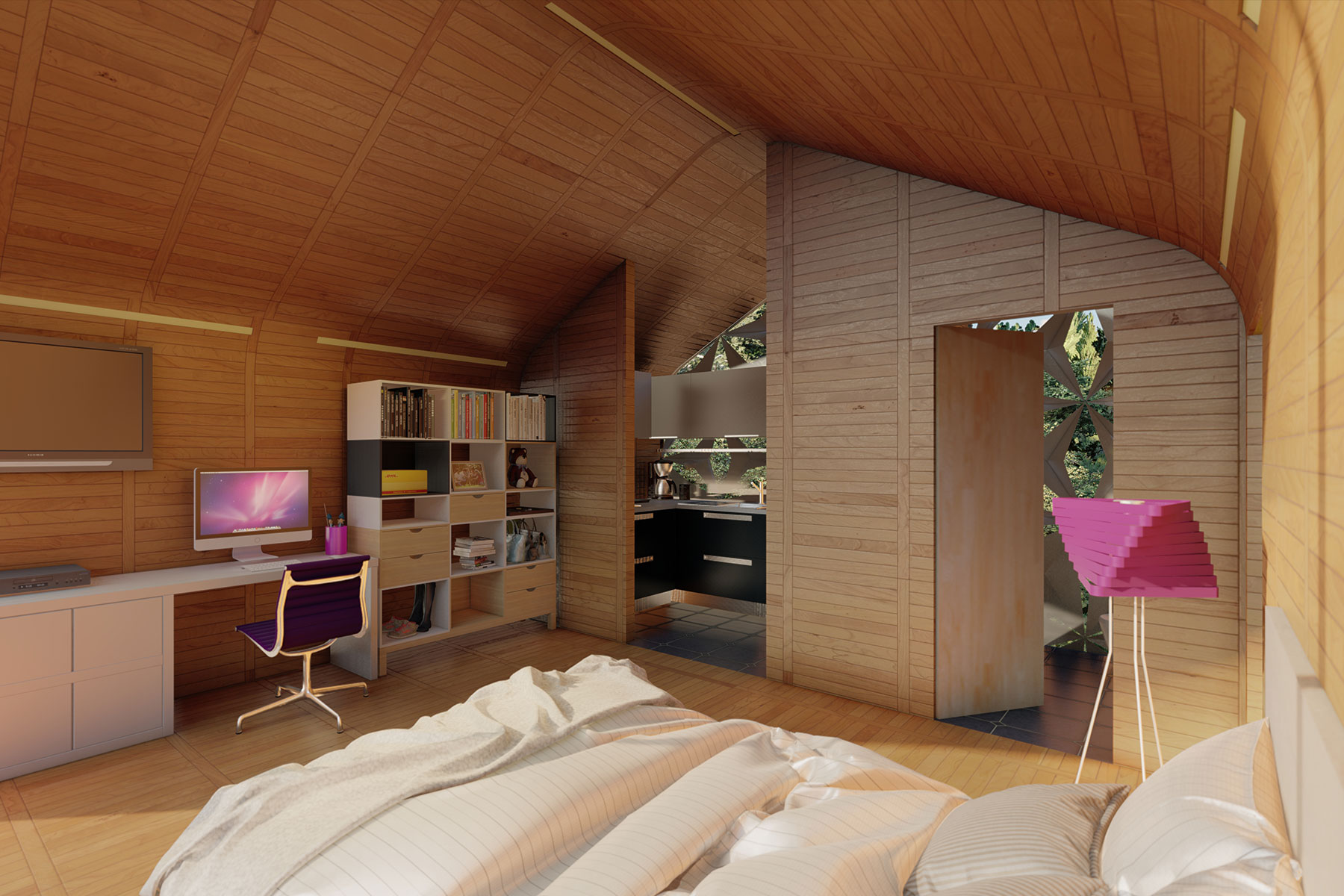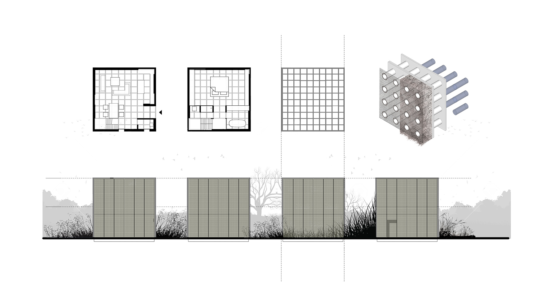 Pokud udržitelnost již nestačí, musíme nově budovat a nově růst. Domek s nízkou uhlíkovou stopou, který je také zahradou, by nám umožnil dosáhnout oboje a současně by poskytoval možnosti pro venkovské i ekologické bydlení. Domov se skládá ze standardních, ale také dvou speciálně upravených desek BCORE. První, na míru vyrobená deska, působí jako oplášťovací systém pro vertikální zeleň a druhá deska funguje jako poloprůhledná fasáda okna. Záměrem návrhu je nasypat zeminu za jemnou ocelovou síťku, která by umožnila růstu rostlin, jako je tráva, na fasádách budovy. Trubice BCORE by mohly být uzavřeny průhlednými válci nebo pokryty sklem, aby světlo umožnilo proniknout do prostoru a poskytne výhled ven.