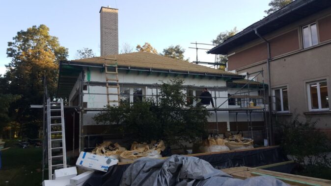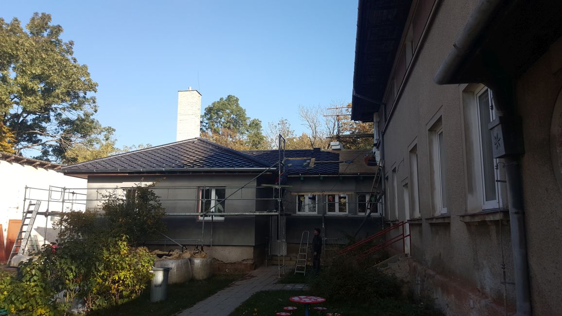 Krásný a reprezentativní tvar střechy podtrhla nová, pečlivě zvolená střešní krytina. Původní eternit musel být odstraněn, neboť do budovy školky zatékalo. Keramická, pálená taška Smaragd v odstínu antracitové plnohodnotně nahradila vzhled a barevnost původních eternitových šablon, současně splňuje mnohem vyšší nároky na údržbu a celkovou životnost. „Preferovali jsme střešní krytinu, která bude pochozí pro běžnou údržbu střechy a komína. Smaragd ideálně kombinoval naše estetické i funkční požadavky,“ vysvětluje Zdeněk Dokoupil. Smaragd z portfolia společnosti Bramac má unikátní čtvercový tvar, který nejlépe vyniká v ploše a dává vyniknout ladným křivkám střechy valbového typu.