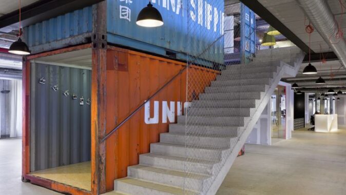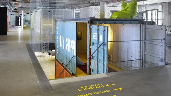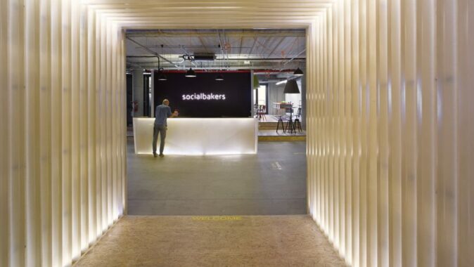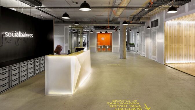 Dvě podlaží spojená novým otvorem se schodištěm nabízí 300 pracovních míst se zázemím pro mezinárodní tým Socialbakers. Namísto dvojitých podlah a podvěsného podhledu jsou tu broušený beton a přiznané instalace. Vnitřní „ulice“ s ambientním osvětlením propojuje jednotlivé departmenty po obvodu. Jejich vymezení je naznačeno buňkami jednacích místností, s barevností příslušných sociálních sítí. Přirozeným centrem je kavárna na podiu za recepcí. V návrhu je podprahově obsaženo téma komunikace, zosobněné jednak námořními kontejnery, surovými autentickými artefakty světových moří, hostící kuchyňky, servery a relax prostory. A jednak v autorských konceptuálních dílech Petry Skořepové. Obvodové betonové stěny jsou pojednány žlutým válečkem. Nábytek a vybavení je kombinací bazarového výběru židlí, perských koberců, a autorským nábytkem D3A z barevných jeklů a přepravek.