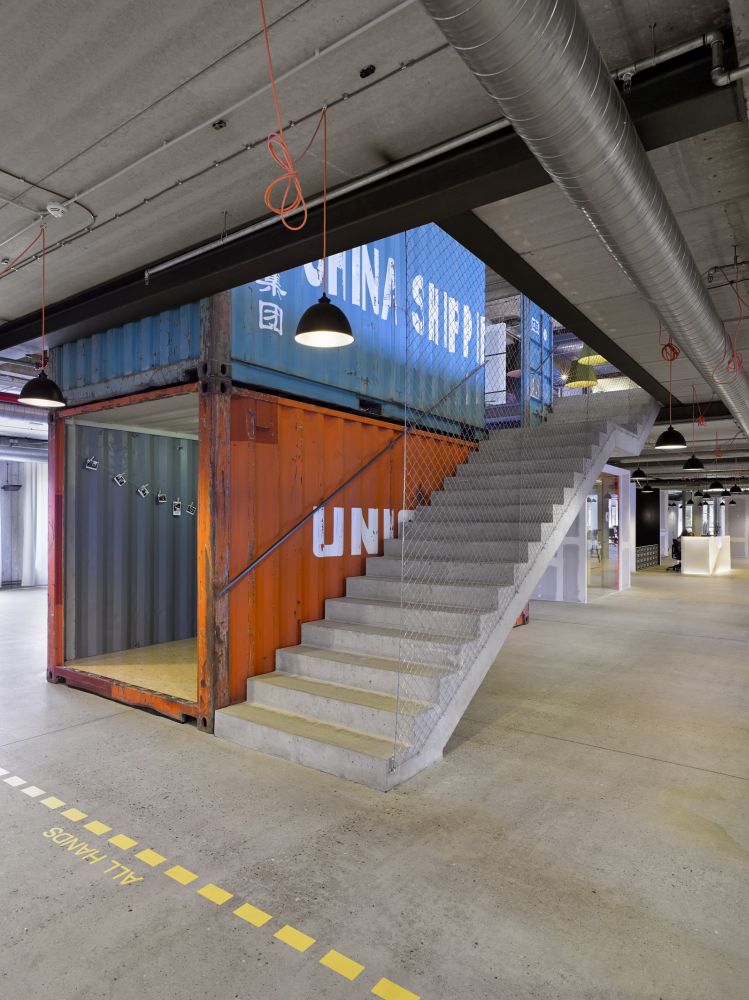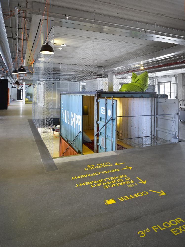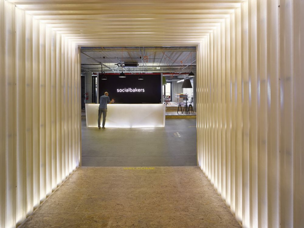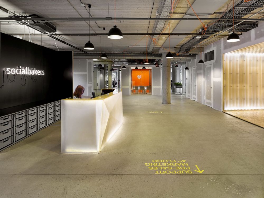 Dvě podlaží spojená novým otvorem se schodištěm nabízí 300 pracovních míst se zázemím pro mezinárodní tým Socialbakers. Namísto dvojitých podlah a podvěsného podhledu jsou tu broušený beton a přiznané instalace. Vnitřní „ulice“ s ambientním osvětlením propojuje jednotlivé departmenty po obvodu. Jejich vymezení je naznačeno buňkami jednacích místností, s barevností příslušných sociálních sítí. Přirozeným centrem je kavárna na podiu za recepcí. V návrhu je podprahově obsaženo téma komunikace, zosobněné jednak námořními kontejnery, surovými autentickými artefakty světových moří, hostící kuchyňky, servery a relax prostory. A jednak v autorských konceptuálních dílech Petry Skořepové. Obvodové betonové stěny jsou pojednány žlutým válečkem. Nábytek a vybavení je kombinací bazarového výběru židlí, perských koberců, a autorským nábytkem D3A z barevných jeklů a přepravek.