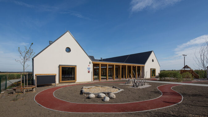 Mateřská škola ve Svojeticích pracuje s vnitřním členěním jako s prostornými třídami, které obsáhnout potřeby dětských aktivit od her po rozložení spacích matrací. Místnosti jsou tedy nadimenzovány tak, že zabírají velkou část dispozice. Právně v nich se odehrává hlavní náplň aktivit. Chodby pak slouží spíše jako komunikační prostor. Hlavní sdílený veřejný prostor uvnitř dispozice je v podobě dvora, který jednak odkazuje k dvorům jako vesnickému archetypu, jednak splňuje parametry pro chráněný venkovní prostor, kde jsou děti v bezpečí. Celková dispozice ho přirozeně obtéká. Mateřskou školu obklopuje zahrada se záhonky pro pracovní výchovu a další hřiště, tím se objekt posunuje do pozice solitéru na parcele. Ta je zatím umístěna v poloprázdné okrajové části obce. Lokalita by dle nového územního plánu měla později zarůst další zástavbou. Tím by se i školka více integrovala. Zároveň by ale zůstávala v relativně klidové zóně. Program školky je doplněn o kuchyňský blok po přípravu čerstvého jídla, z něhož se pak jídlo rozváží do tříd. Ve vnitřním členění najdeme ještě dvě další zajímavé prostory. Menší třídu pro ještě mladší děti, které by zatím školka povinně absorbovat nemusela, ale dle blížící se nové legislativy bude tato nutnost čekat na všechny mateřské školky. Další třída je zamýšlena jako volný prostor pro potřeby obce. Místnost je navíc přístupná odděleně a příchozí se tak nemusí místit s provozem školky. V běžný čas je tato místnost zaplněna jako tělocvična pro děti. Díky tomu tento objekt nabývá nový význam v kontextu celé obce.