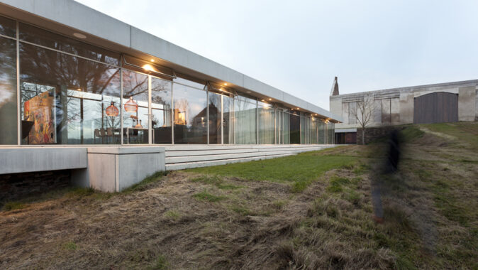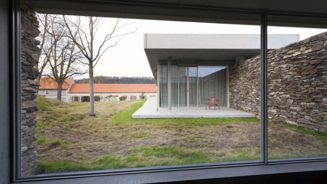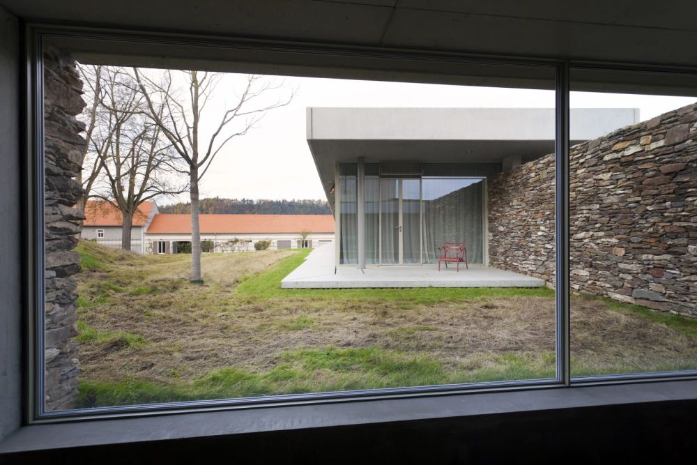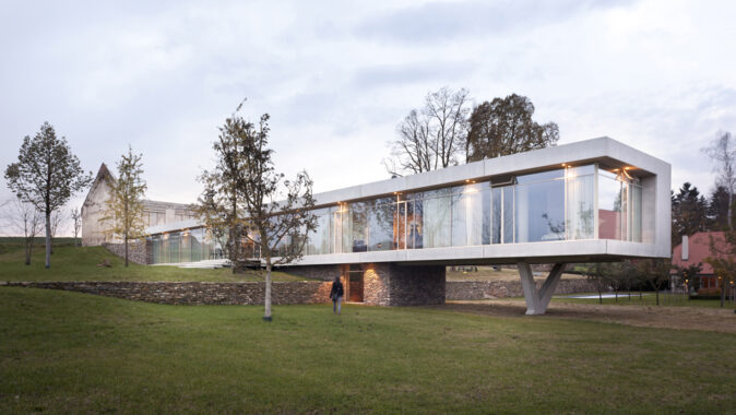 Samotná novostavba byla navržena v modulu 1200 mm a je tvořena téměř celoproskleným hlavním obytným podlažím sedícím ve spodní části na soklu suterénu s technickým a provozním zázemím objektu. Fasáda soklu je z místního kamene, konstrukční souvrství podlahy a střechy hlavního obytného podlaží přesahující po celém obvodu do prostoru o 600 mm jsou kryté prefabrikovanými betonovými dílci. Fasáda budovy tak tvoří vizuálně minimalistický koncept čtyř pruhů fasády: kámen – beton – sklo – beton se postupně vynořují ze svahu, vystupují nad terén, ve spodní části se od terénu přízemí odpoutává a končí v prostoru na železobetonové podpěře tvaru „y“ s výhledem do krajiny.