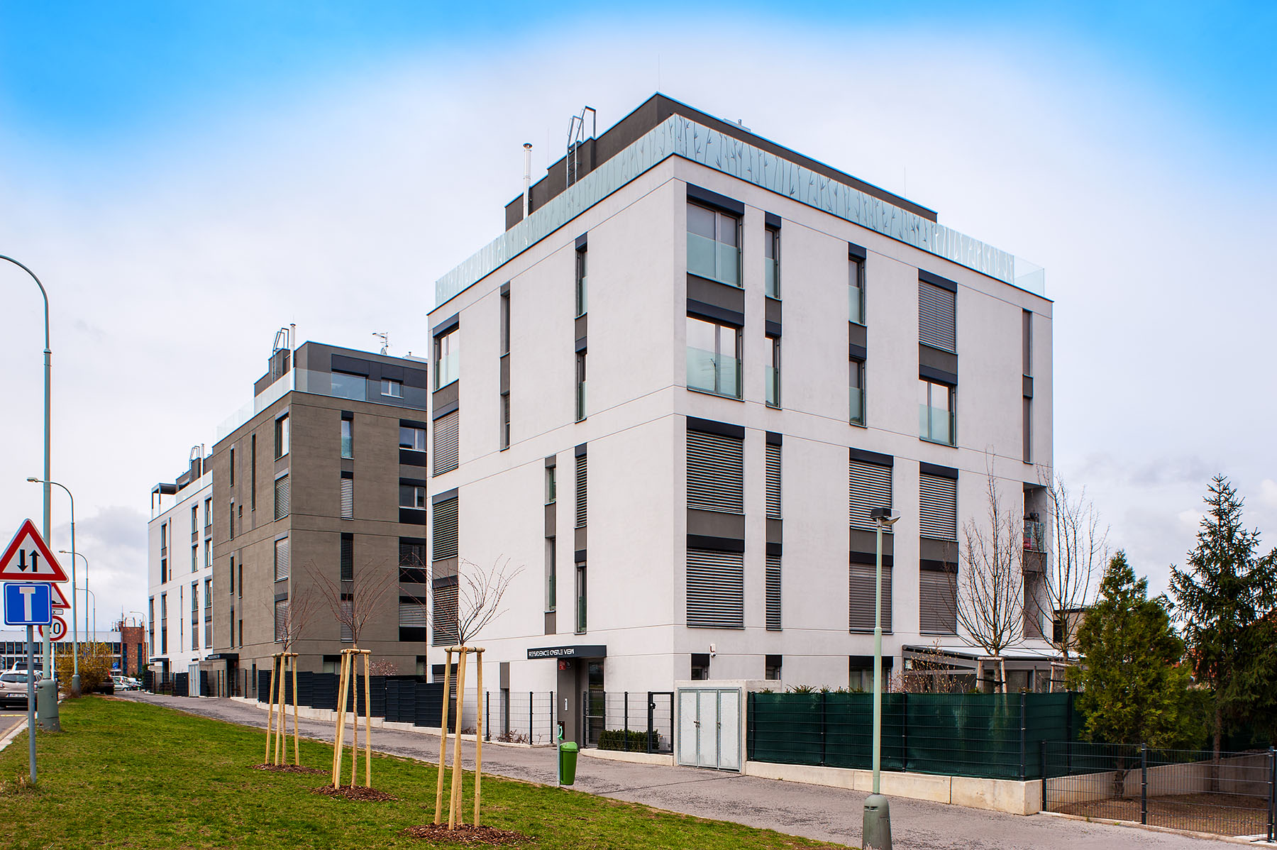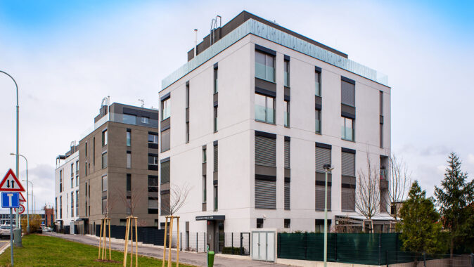 Odůvodnění poroty: Soubor bodových bytových domů zaujal porotu svojí střídmou, uměřenou architekturou založenou na dobrých proporcích a kvalitním řemeslném detailu spojených do nevtíravě elegantního celku. Na fasádách se střídají hladké povrchy vytvořené kombinací podkladu z točené omítky CreativeTop Fine a zakletovaného povrchu Creative Silk s tmavšími jemně vroubkovanými povrchy vytvořenými zubovým hladítkem aplikovaným na omítkovinu CreativTop Pearl.